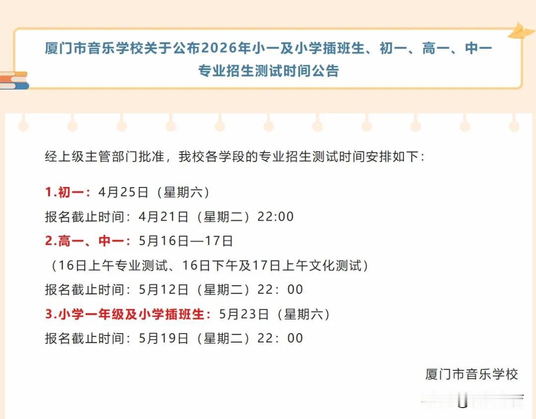 2026厦门小升初提前批第一校正式开考,2026厦门小升初在别的学校都没有消息的前提下,音乐学校确定了考试时间是4月25日,也就是下周六。报名时间大家一定要注意截止到4月21日!