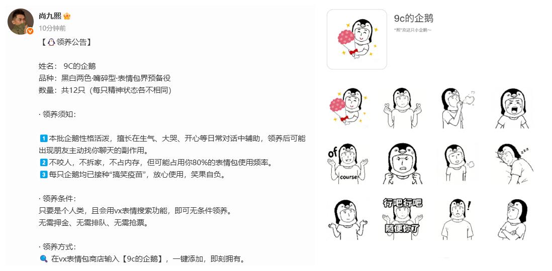 尚九熙出表情包,喊话网友来领养,附带说明和须知!德云社尚九熙发文,分享了自己创作的一组表情包。这组表情包由12只企鹅组成。为了让网友了解、熟悉自己创作的表情包,尚九熙还发布了一则领养公告,附带说明和须知。看到尚九熙这么有仪式感,这么有新意,网友也纷纷留言感谢。在众多留言中,有一位的特别逗乐。他悄悄地对尚九熙说,你人真好。