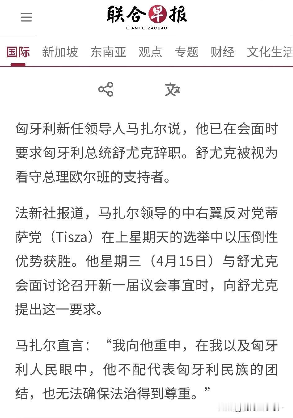 4月15日,匈牙利候任总理毛焦耳在约见该国总统舒尤克后称,总统“不配成为匈牙利的团结象征”并要求他“识相点体面辞职”,毛焦耳还说,“如果他不走,那么我们将动用选民赋予的授权,通过修改必要法律罢免他”。