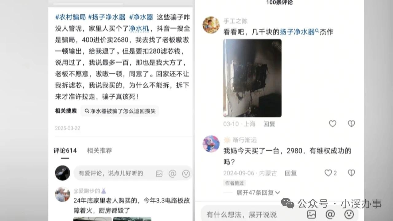 当天下午,房大叔的女儿就得知了此事。房女士说,家中的日常用水主要依靠井水,净水器根本无法安装使用。而且经过上网搜索,她发现关于这个扬子牌净水器的负面新闻非常多,甚至还发生过面板起火烧毁房屋的意外事故。