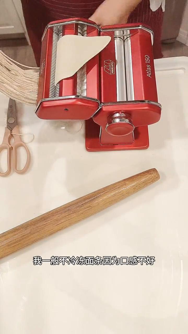我捏的一个面团大概是一人量,下锅之前现压,吃不了的面团冷冻起来。我一般不冷冻面条,因为口感不好,下次把这个面团化冻再压,还是新鲜口感的面条。加拿大本地这种高蛋白、高质量的小麦粉,做中式面条简直完美。