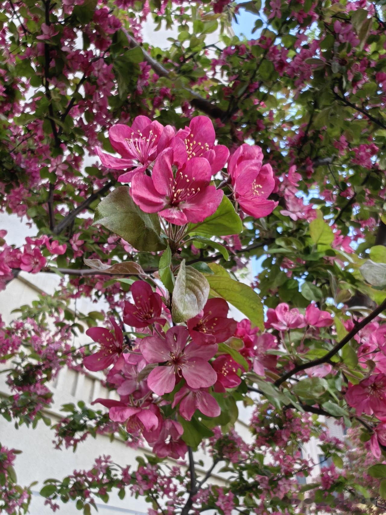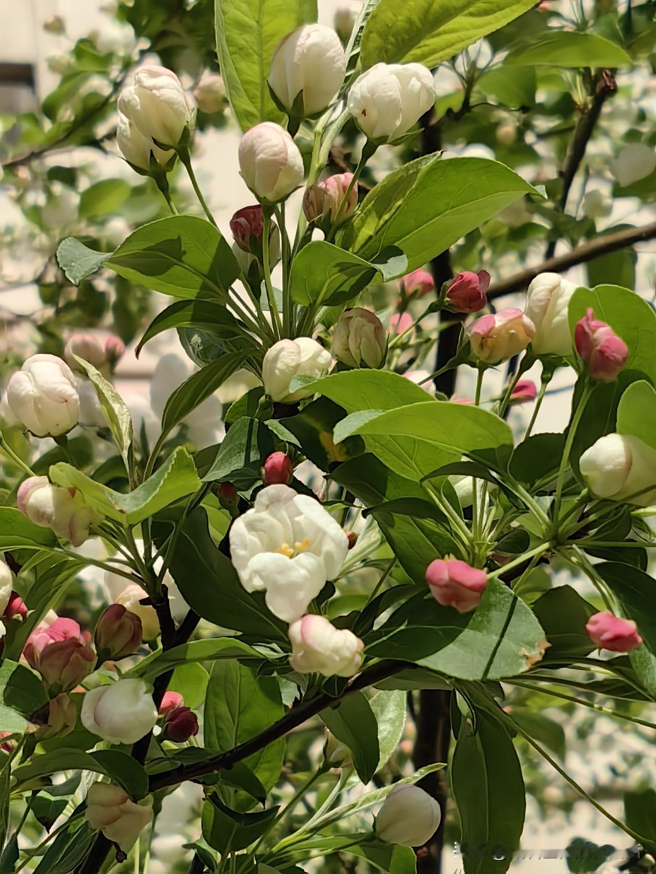 先是满枝的花苞,粉白绛红,碎碎的,像夜里洒了一树星子;过几日再看,全开了。