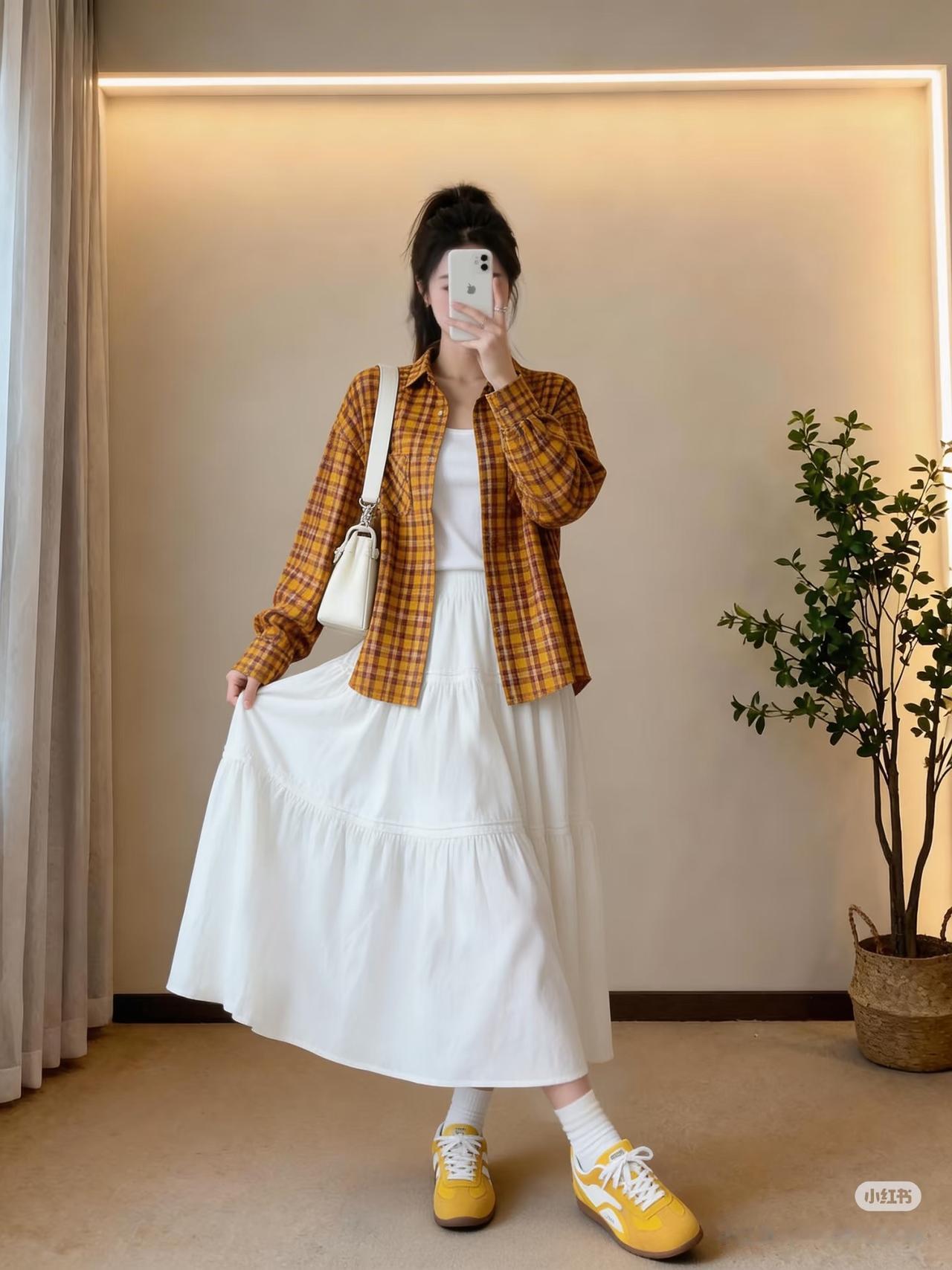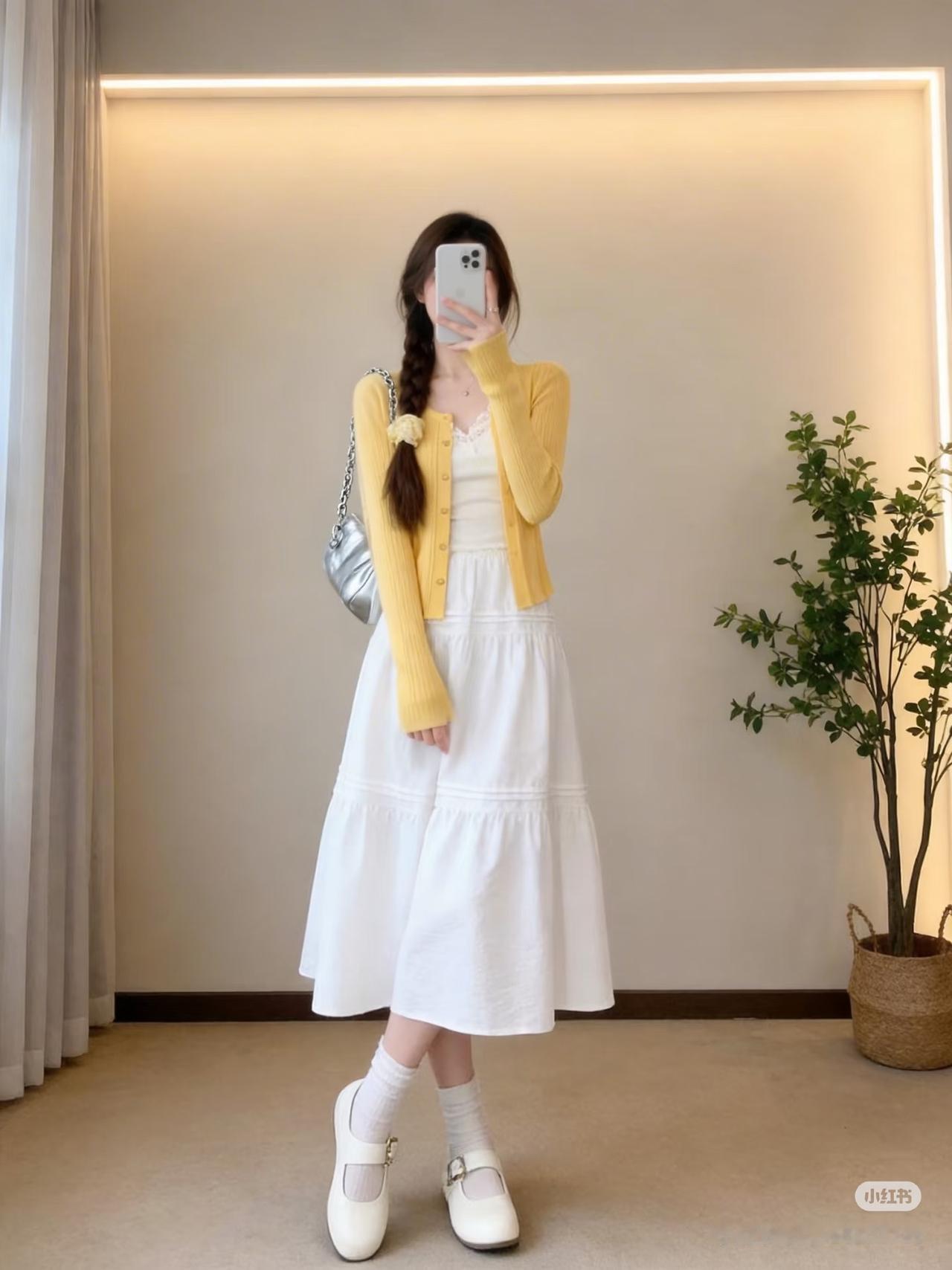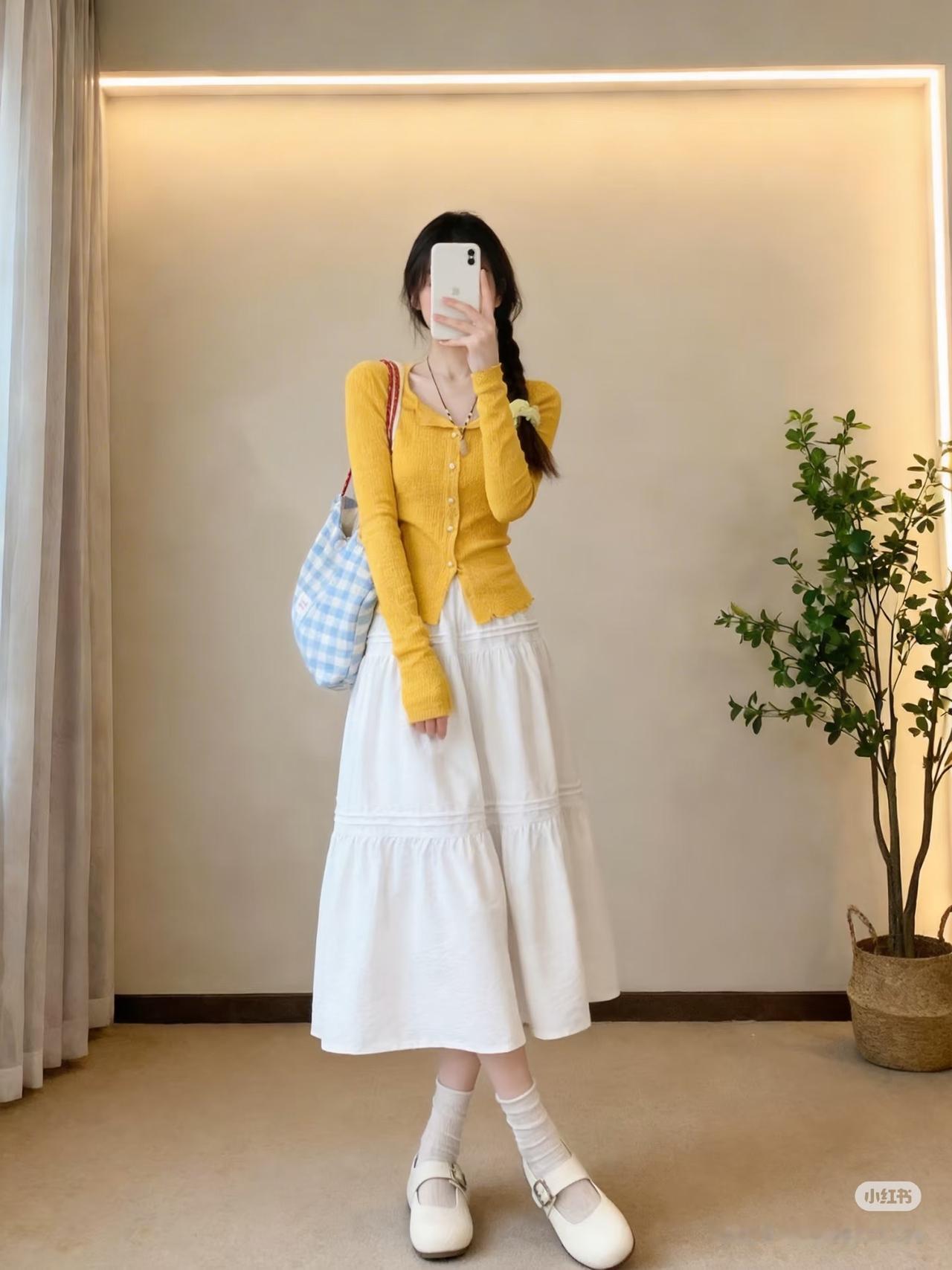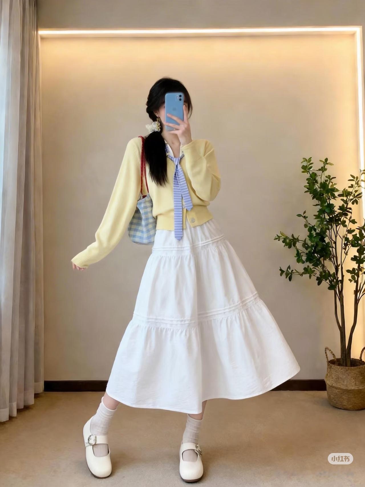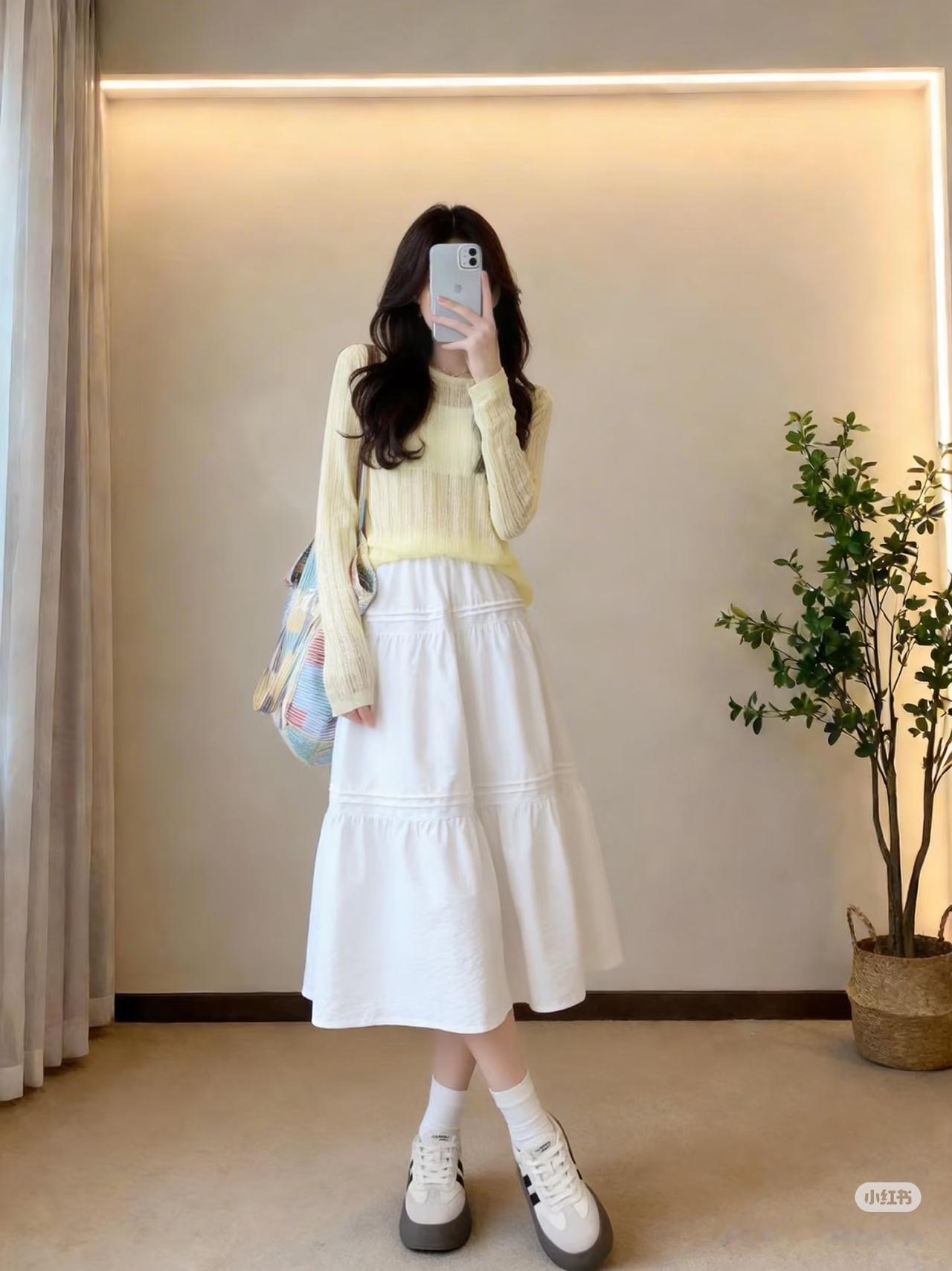 🔔🔔🔔这 6 套长款白色蛋糕半身裙合集!裙子有内衬、面料软,搭黄色上衣绝绝子,直接抄作业!