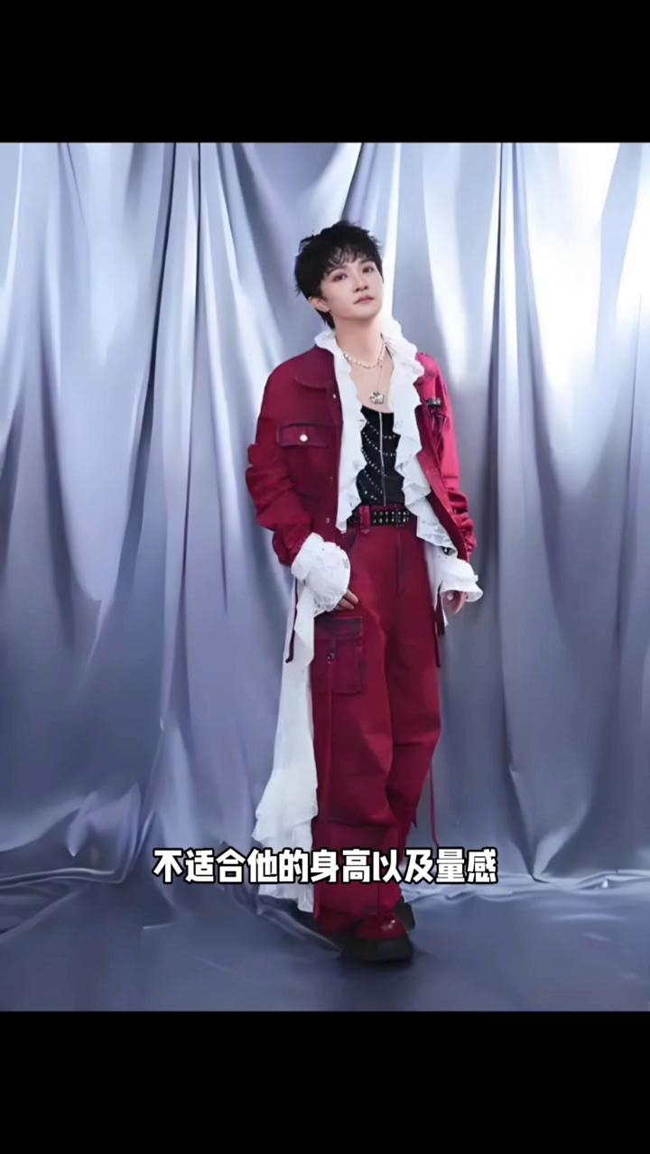 这一身虽然还是上短下长,上下身一个颜色,但装饰了很多蕾丝的花边,裤子上有很多的口袋,这些白色的蕾丝荷叶边和裤子上的口袋对于周深来说设计的过于繁琐、啰嗦、邋遢,不适合他的身高以及量感。去掉白色蕾丝荷叶边,整个人显得更清爽,明显变得又利落又高冷。