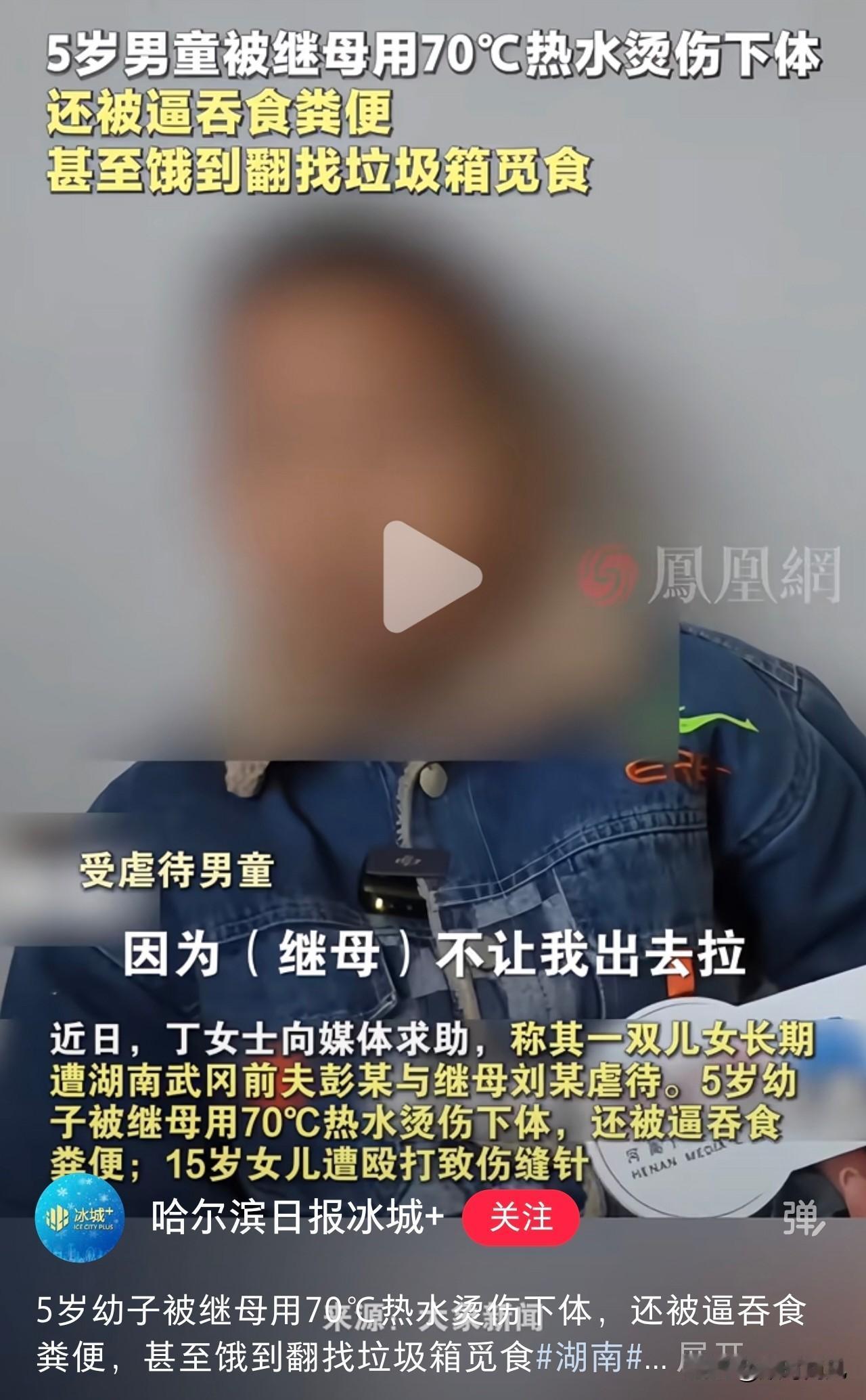 恰好最近看到一则关于姐弟两个被继母虐待的新闻,女孩子是姐姐,年龄大点,懂得察言观色,能蹲着继母一点,但弟弟还小,被继母用70度开水烫下体,浑身外伤超过45%的面积,被逼吞大便,天天垃圾桶翻吃的……不给生母探望,后来好不容易见着了,把两个孩子接身边了。