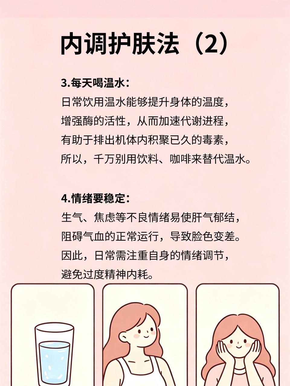 很多女生花大价钱买护肤品🧴,却还是摆脱不了长痘、暗沉、长斑,其实问题根本不在脸上,而在体内—内调不通,外在再护肤都是徒劳,女生养颜,内调才是王道💪。分享4个内调小技巧💡,比护肤品更管用,坚持一段时间,皮肤自带光泽。