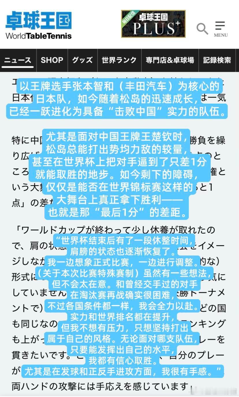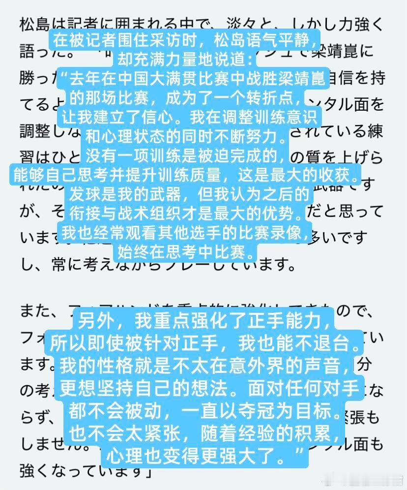 松岛辉空:世界杯结束后休整了一段时间,肩膀状态也逐渐恢复了。发球是我的武器,但我认为之后的衔接与战术组织才是最大的优势。另外,我重点强化了正手能力,所以即使被针对正手,我也能不退台应对。我的性格就是不太在意外界的声音,更想坚持自己的想法。面对任何对手都不会被动,一直以夺冠为目标。也不会太紧张,随着经验的积累,心理也变得更强大了。