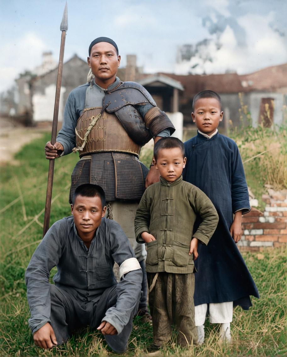 这张照片记录下这样一幕,一名汉奸带着两名孩童与日本兵合影,日军身着训练服饰、手持