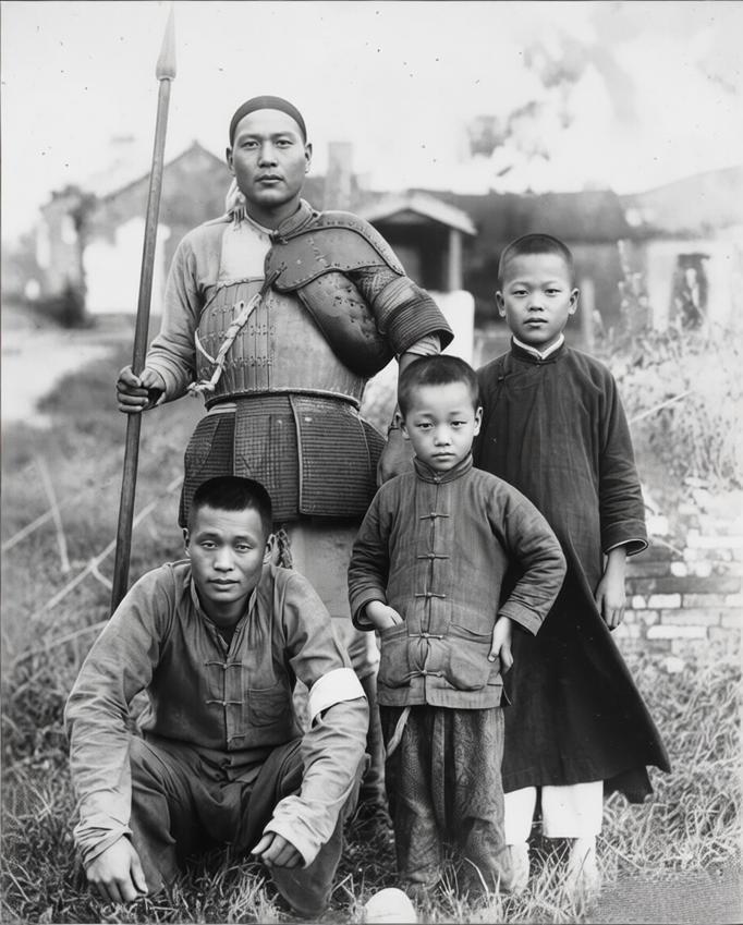 这张照片记录下这样一幕,一名汉奸带着两名孩童与日本兵合影,日军身着训练服饰、手持木枪,可见其正在开展拼刺战术演练,汉奸的手臂上佩戴着白布标识,这是当时汉奸依附日寇、背叛民族的标志。照片中的汉奸面露得意之色,尽显狐假虎威、仗着日寇势力耀武扬威的丑恶嘴脸。