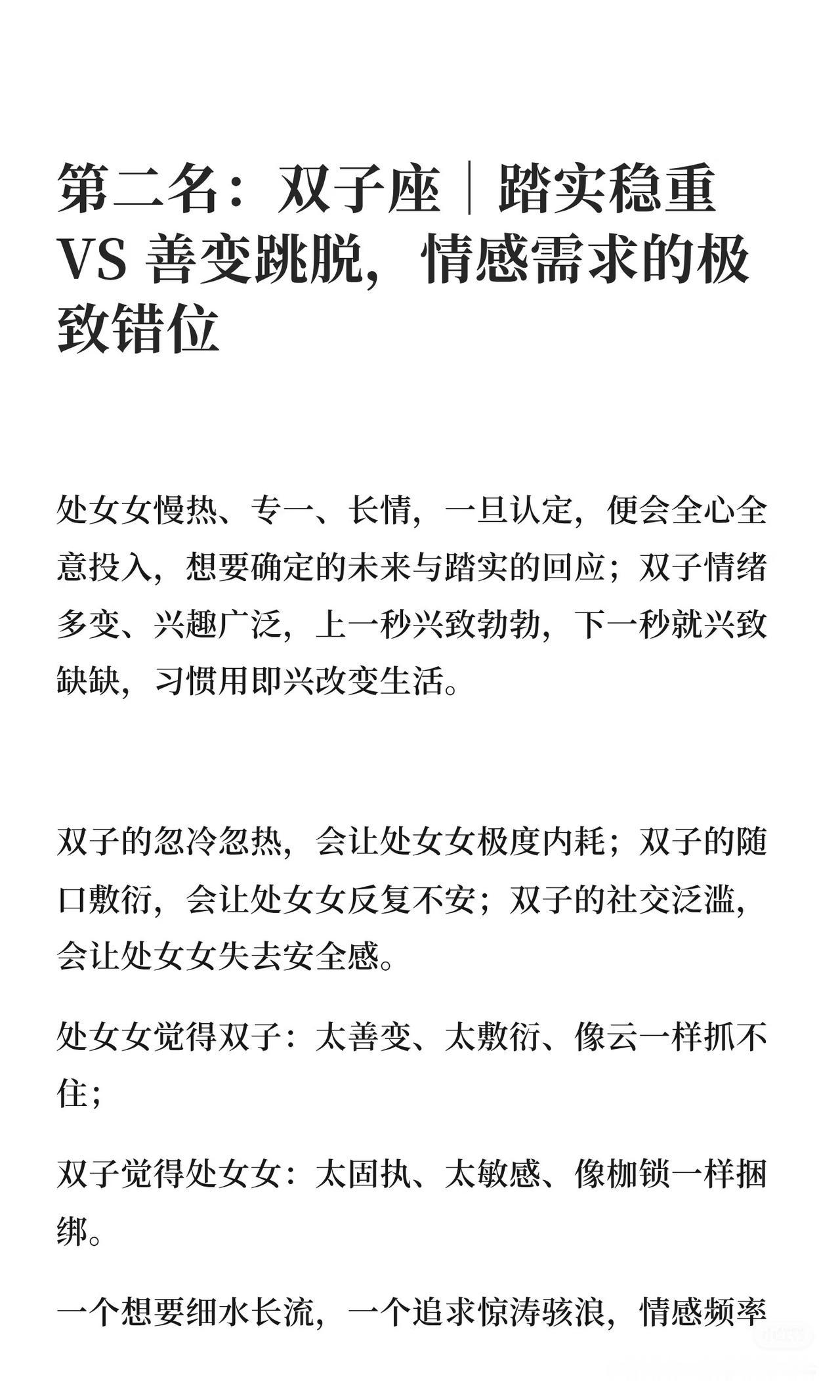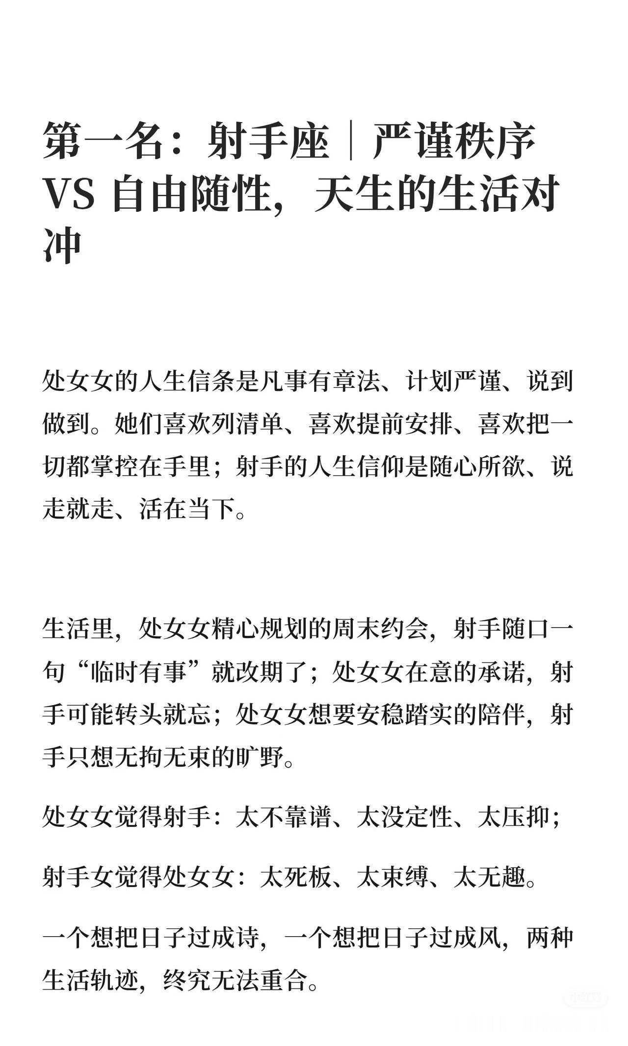 处女女追求完美、注重细节,与射手、双子、白羊三星座在生活节奏、情感需求和日常细节上错位,相处常感折磨。射手随性、双子善变、白羊冲动,与处女女的严谨、专一形成鲜明对比,难以找到同频共振的伴侣。