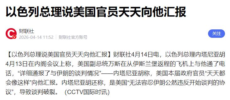 内塔尼亚胡公开透露,美方每天都会就伊朗问题向他报备,万斯更是详述了美伊和谈的全部细节,美国本届政府官员,一直都在保持这样常态化的汇报沟通。