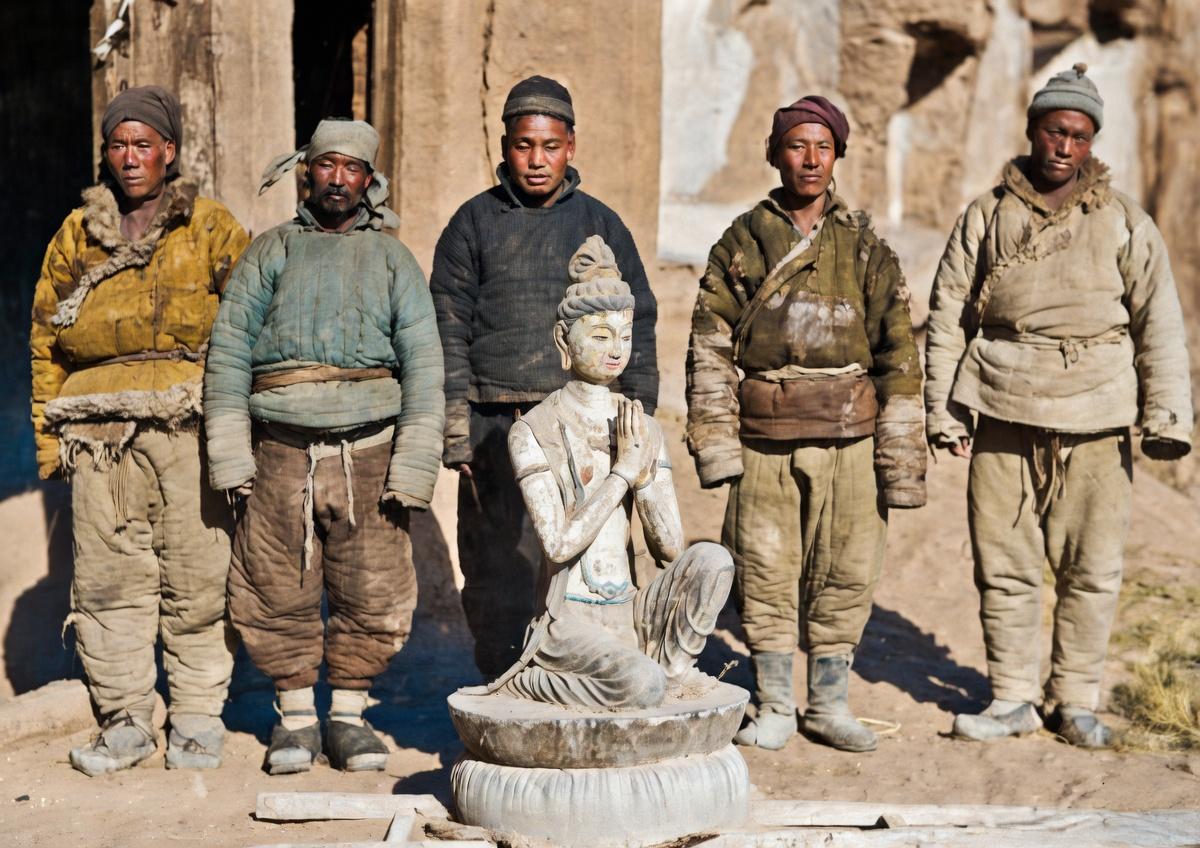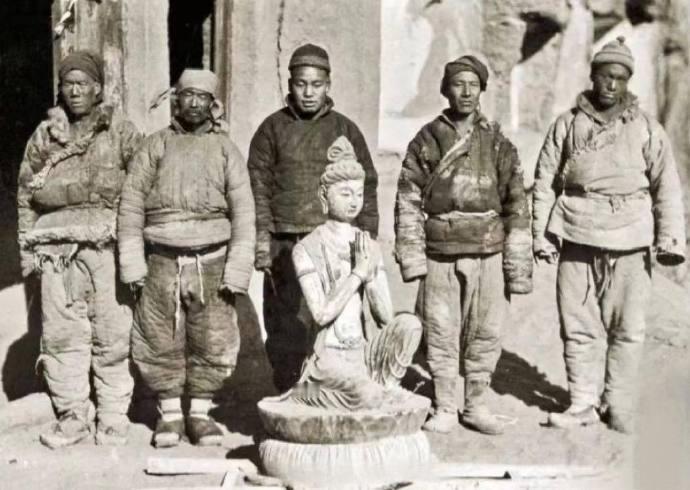 照片中站在佛像身后的五人,是华尔纳强行雇佣的当地民工。华尔纳强迫他们与被盗凿的佛像合影,本质是为自己的掠夺行为留下“成果记录”,这张照片也因此成为华尔纳盗窃中国文物、破坏文化遗产的铁证。
