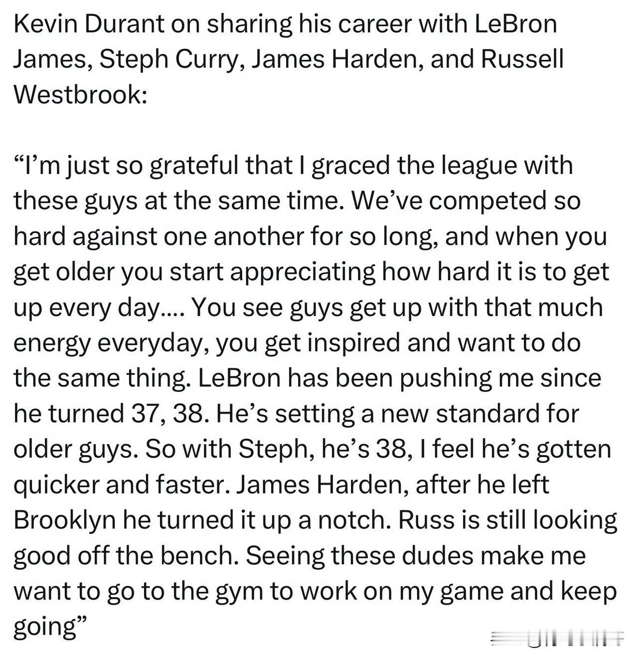 近日,杜兰特也是谈及到了与詹姆斯、库里、哈登和威少同处一个时代的感受:
