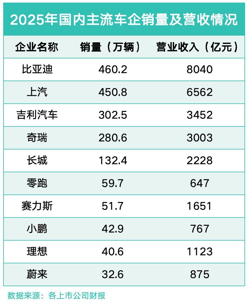 从营收维度来看,头部车企的规模优势进一步凸显。比亚迪以8040亿元的营收规模稳居行业榜首,展现强大的经营实力。上汽、吉利、奇瑞、长城依次位列第二至五位。这背后,离不开销量的稳健增长。2025年,比亚迪销量达460.2万辆,连续多年保持高增长态势。上汽集团、吉利汽车、奇瑞汽车、长城汽车分别以450.8万辆、302.5万辆、280.6万辆、132.4万辆紧随其后。