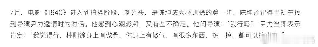 陈坤新片饰演林则徐电影1840官宣终于等来了电影1840官宣!看陈坤为了更好的诠释林则徐这个角色花了很多的心思,剃光头和特意增肥都是为了为角色服务。也期待《1840》剧组和坤哥的北影节亮相了!