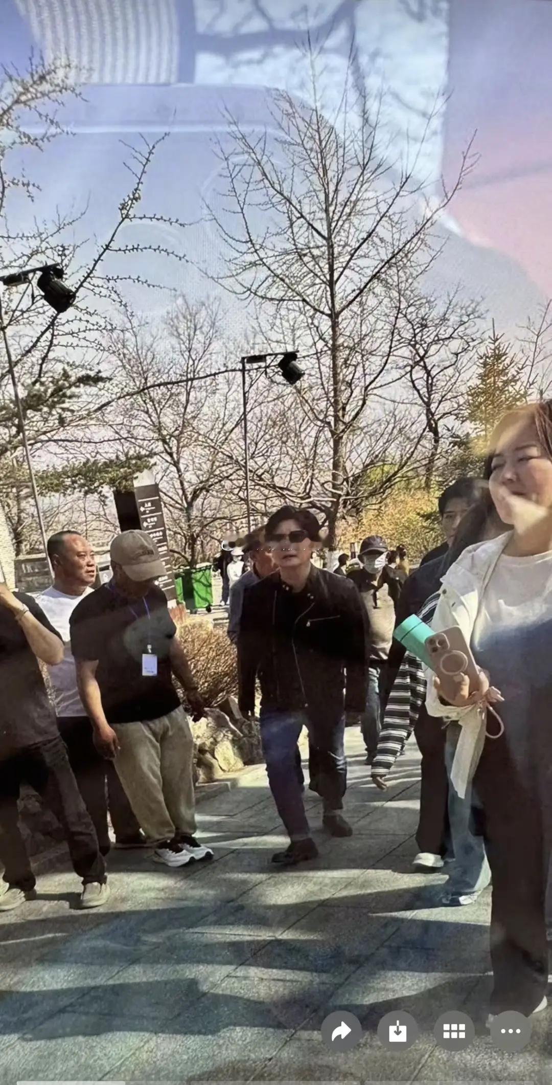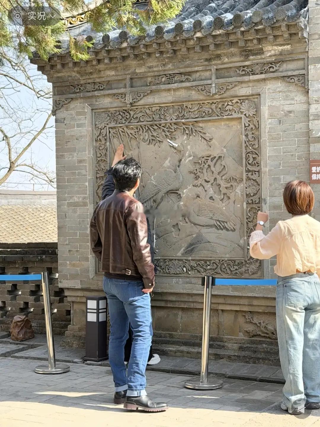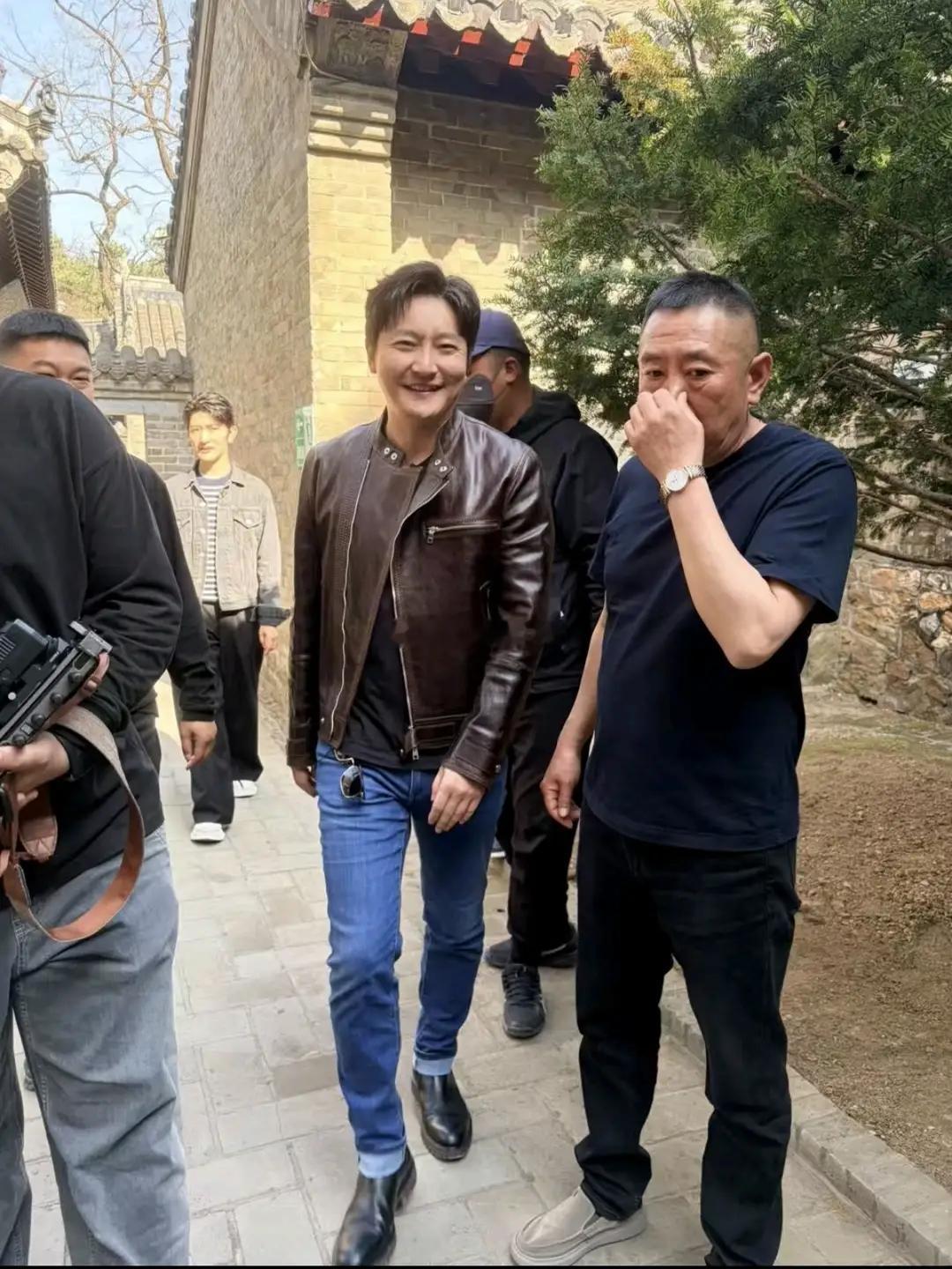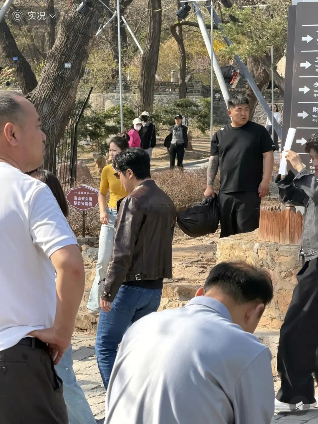 郭京飞大孤山被偶遇皮衣牛仔裤墨镜很帅气,一直笑眯眯的接地气!!!!!!