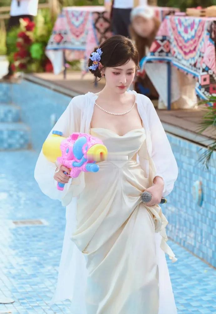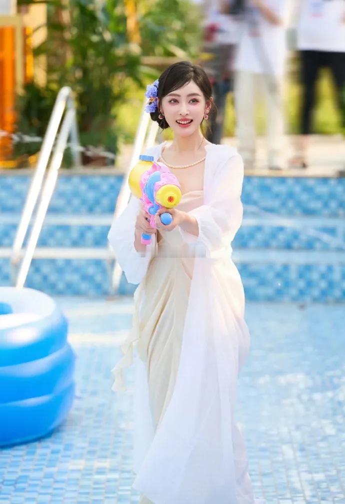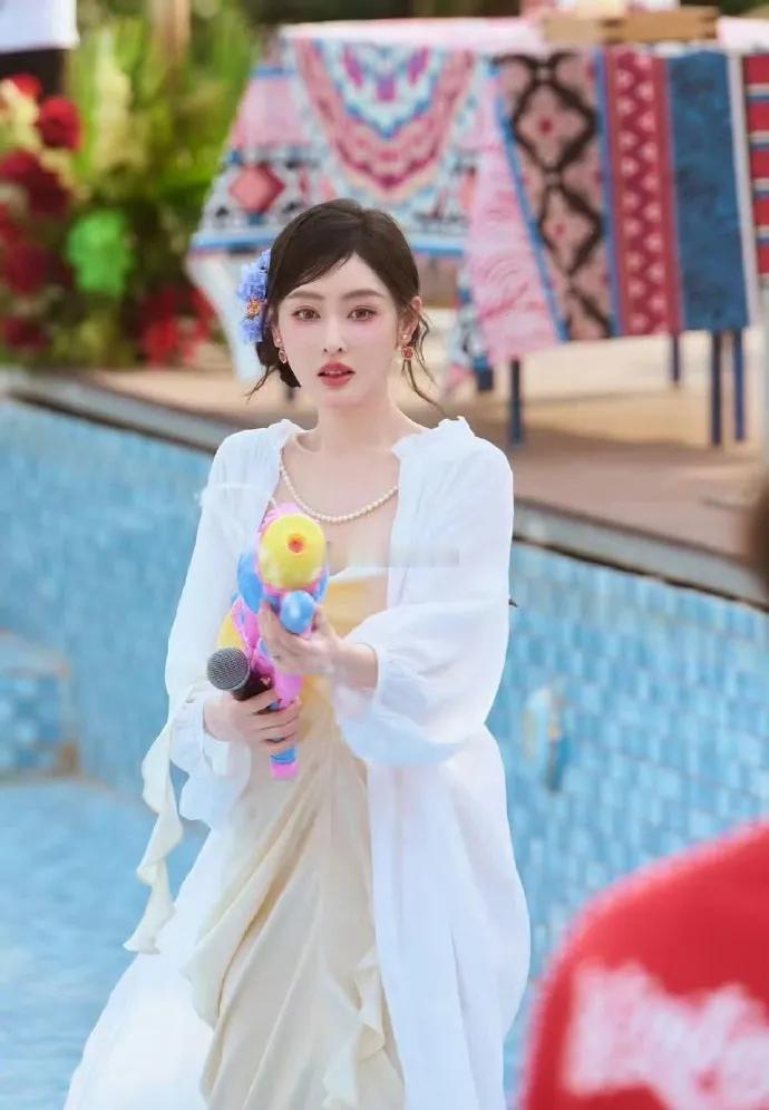 张天爱现身西双版纳像个迷人的春日仙子,一件白色的裙子,裙子上面有很多迷人的褶皱,