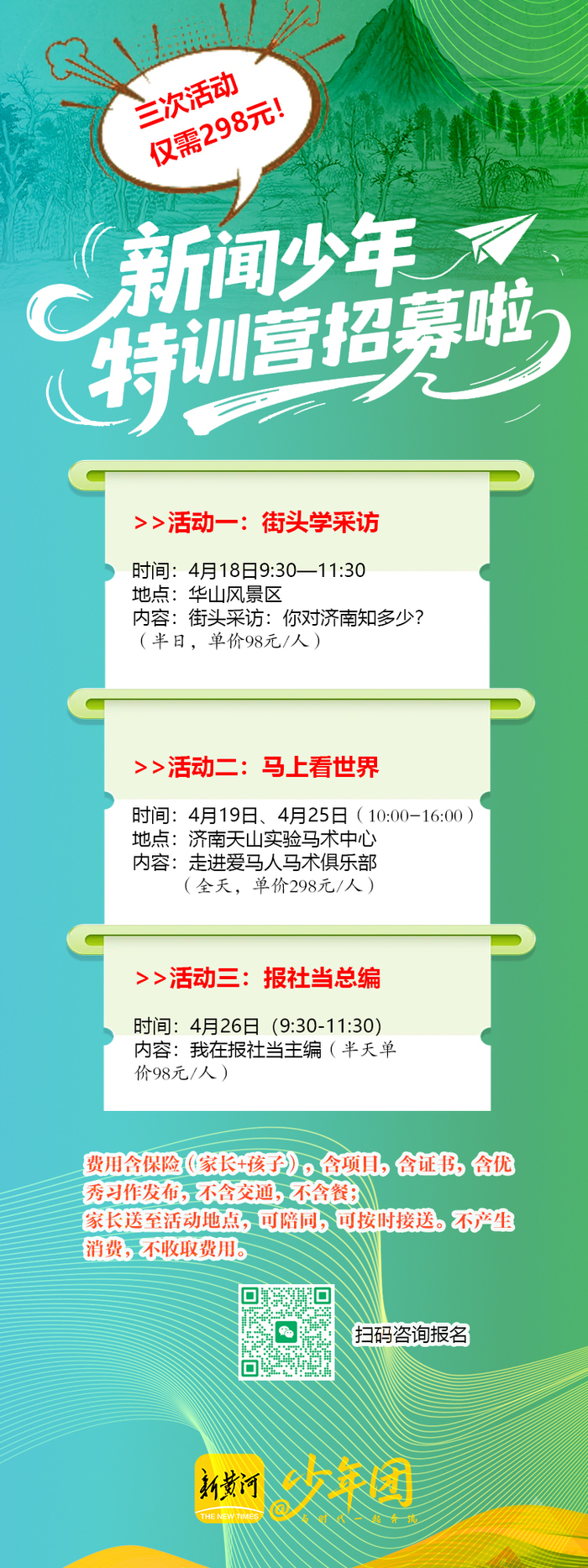 新黄河少年团重磅招募!如果你是敢于尝试、渴望成长的中小学生,那就报名新黄河少年团“新闻少年特训营”吧。特训营聚焦少年综合素养提升,打造沉浸式新闻体验场景,三场精心设计的实践活动,从跟随资深记者一起实战采访,到天山实验马术中心的马上看世界,再到济南报业大厦的“一日主编”初体验,每一次实践都是成长的勋章。原价494元,限时298元,名额有限,先到先得!