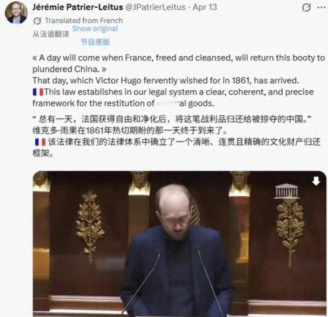 国民议会议员热雷米在现场念出雨果 161 年前的话,希望干净的法兰西把掠夺品还给中国,这番表态让整个事件多了几分历史的温情。