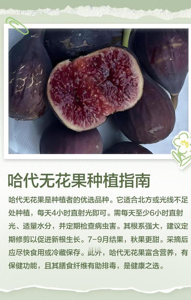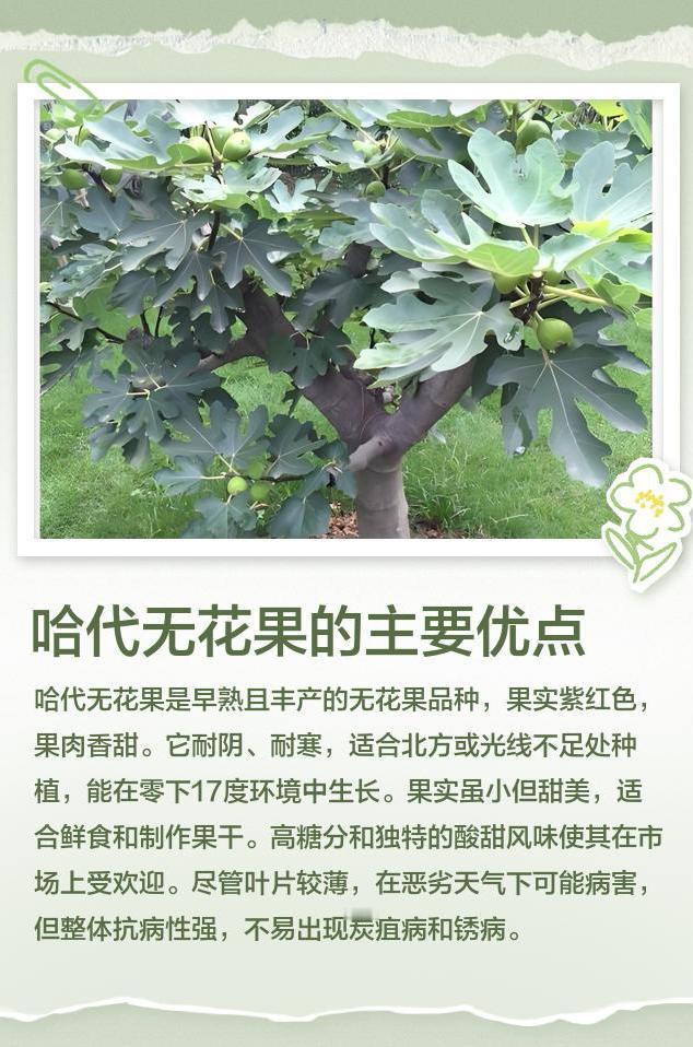 哈代无花果、它耐寒性超棒,能在-18℃的低温环境下存活,在北方部分地区也能露地种植,这可是很多无花果品种比不了的。哈代无花果中等大小,成熟时果皮是黄绿色,果肉呈桃红色,口感软糯香甜,甜度能达到18度左右。它结果能力强,产量也比较可观,一棵成年树一年能产果40 - 50斤。无论是鲜食,还是制作成果干、果酱,味道都很不错。要是喜欢种果树,哈代无花果是个不错的选择。