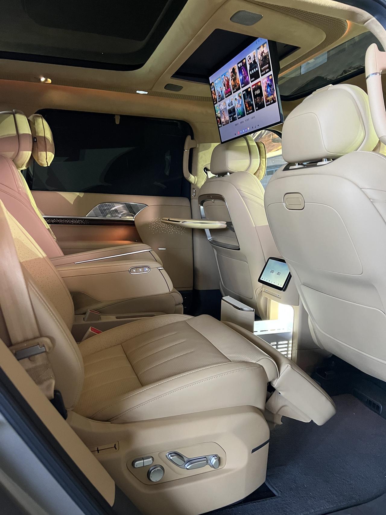 座椅:2+2+2六座布局。前排加热/通风/按摩,副驾零重力。二排右侧零重力,左侧舒适座椅,同样配齐电调、加热、通风、按摩。加上吸顶娱乐屏、冷暖冰箱、33扬声器音响、主动降噪,舒适性很足。第三排支持电动调节和加热,可完全放平。