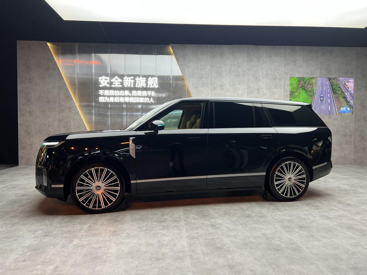 外观:封闭式前脸+贯穿灯带,侧面饱满带悬浮车顶,22英寸轮毂+电动踏板,有点路虎揽胜的影子。尺寸够大——车长5265mm,轴距3115mm,比问界M9、理想L9都大一圈。