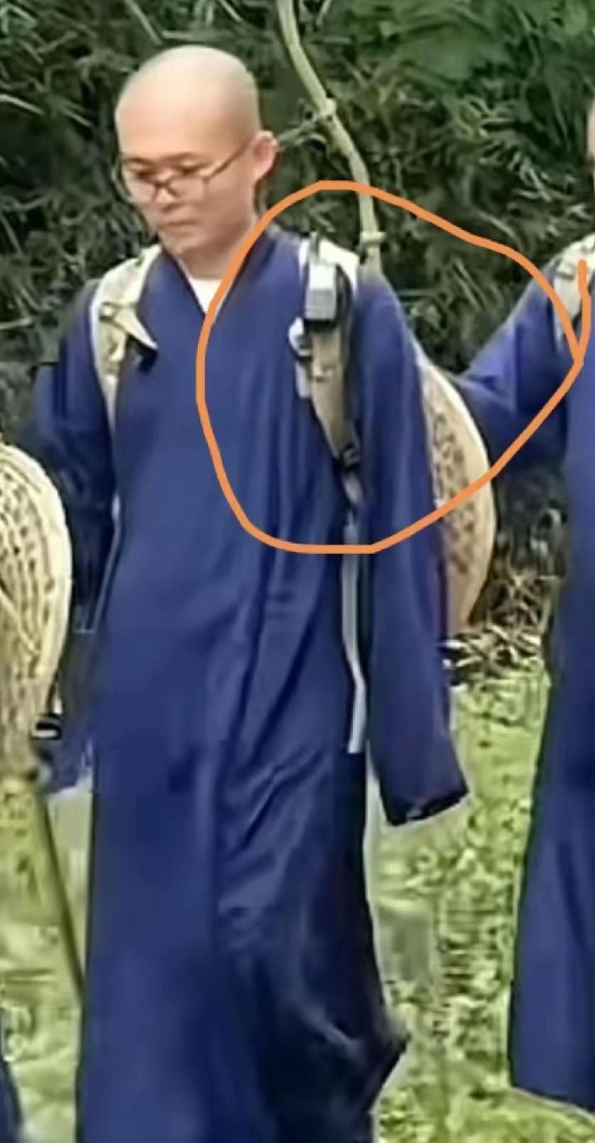- 装备反常:他们背着专业登山包、手持登山杖,部分人还带着斗笠、牵着狗,装备更像户外徒步的驴友,而非传统行脚僧的朴素装束。更可疑的是,有网友圈出细节,发现部分人员手臂、面部衔接不自然,疑似佩戴硅胶面具,身份造假的嫌疑极大。