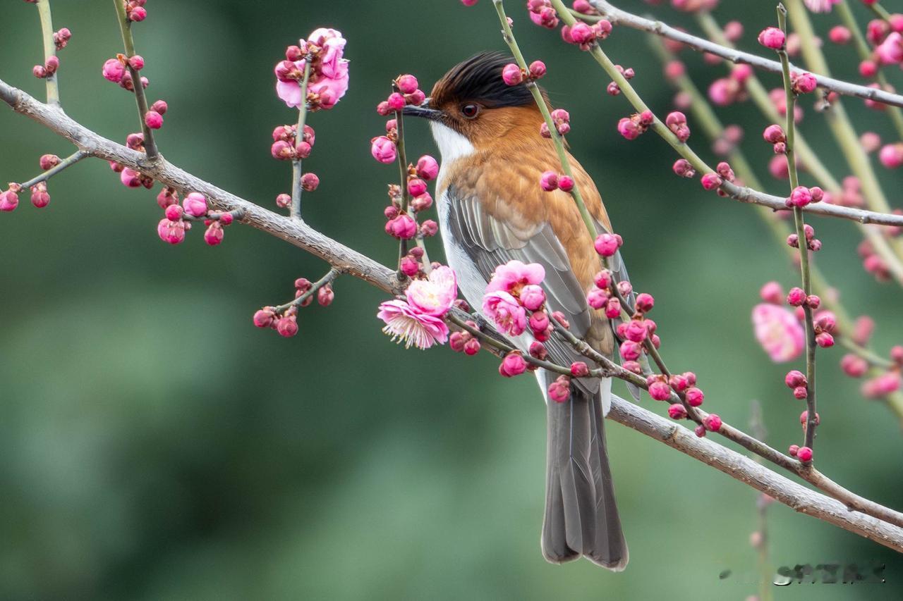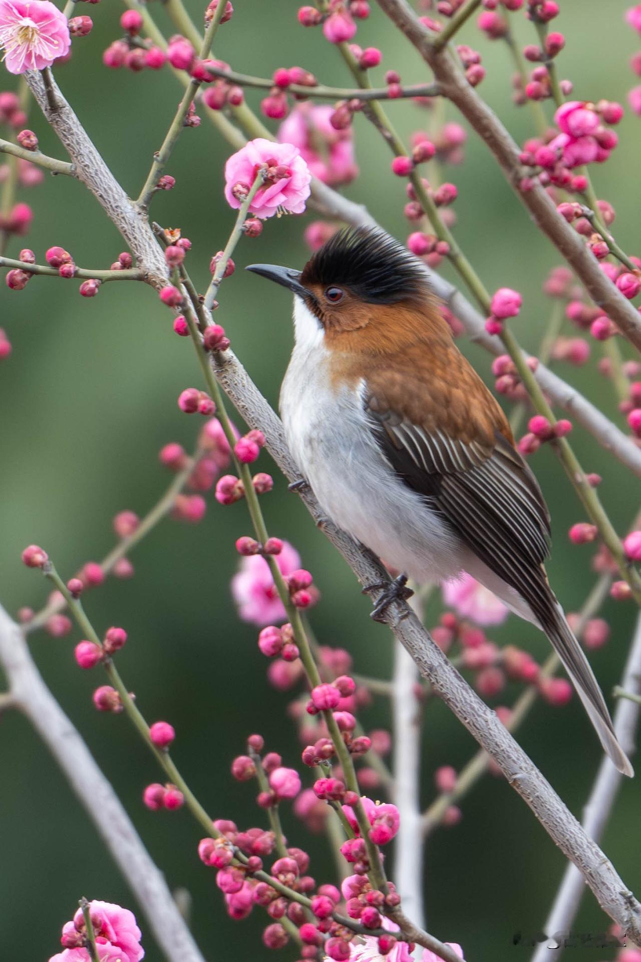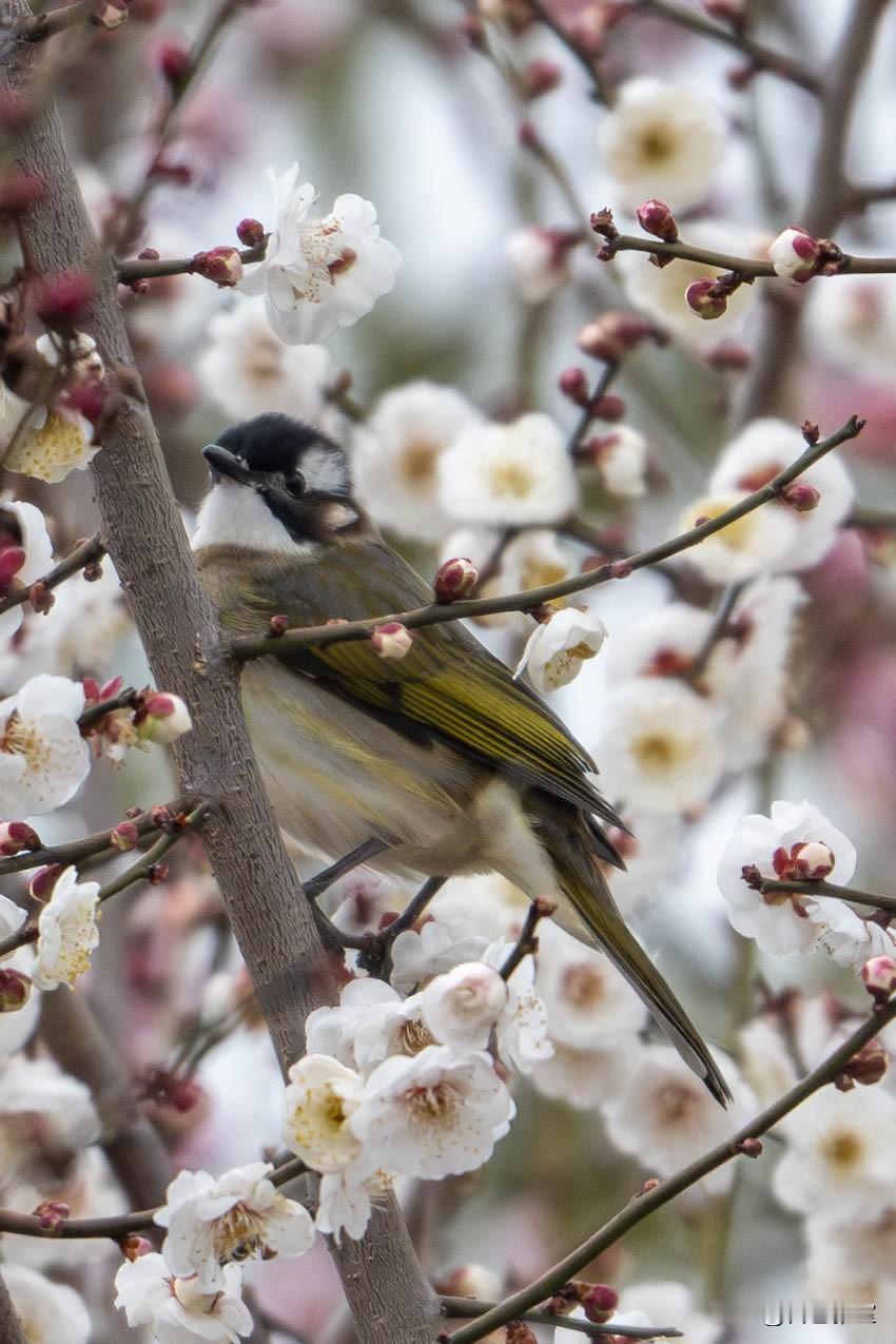 还有那身姿挺拔的栗背伯劳,棕褐的背羽衬着利落的黑冠,红眸锐利如星,静立在缀满花苞的梅枝上,像一位巡视春日的小侠客,自带几分英气。白头鹎则藏在白梅深处,墨绿的羽色与花枝相融,黑白相间的羽冠在素白花瓣间格外醒目,探头的瞬间,满是春日的生机与俏皮。