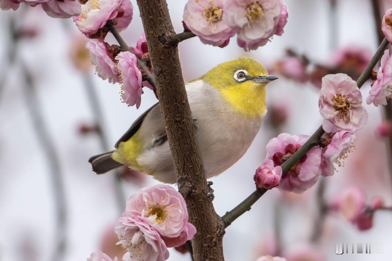 绣眼鸟是枝头最灵动的一抹亮色,嫩黄的羽色裹着蓬松的绒感,标志性的白眼圈像精心描过的眼线,圆溜溜的眼睛透着机灵。它们攀在粉梅枝间,歪头探脑的模样憨态可掬,喙尖还沾着晨露,在繁花间啄食花蜜,把春日的甜意都收进了镜头。