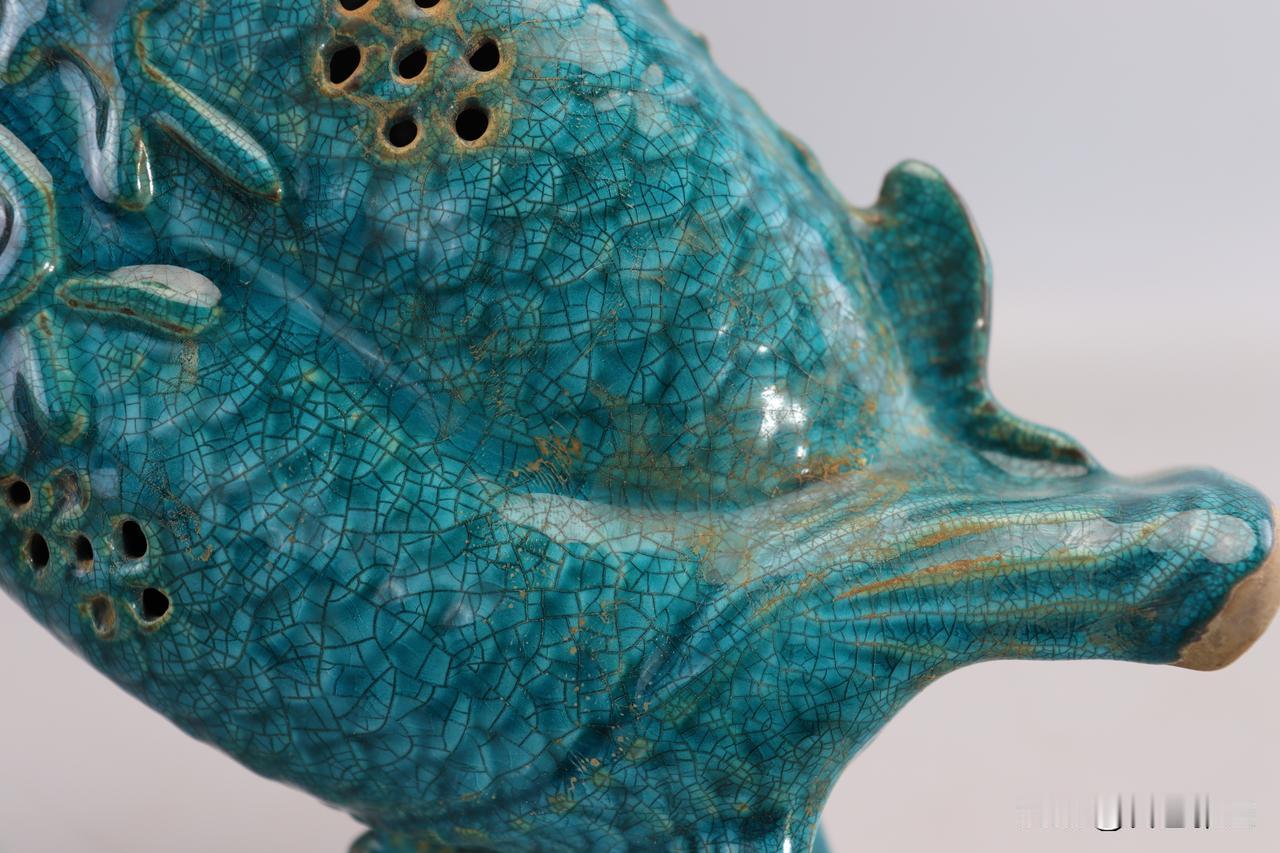 本期聚焦一件五代柴窑孔雀蓝釉开片双鱼“財”字镂空香薰,底款为柴窑标志性凸起“柴”字款,是柴窑仿生瓷的传世珍品。