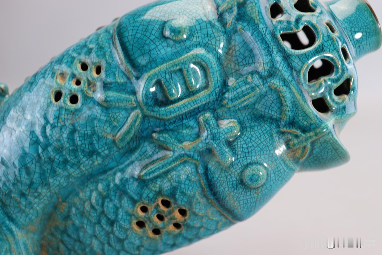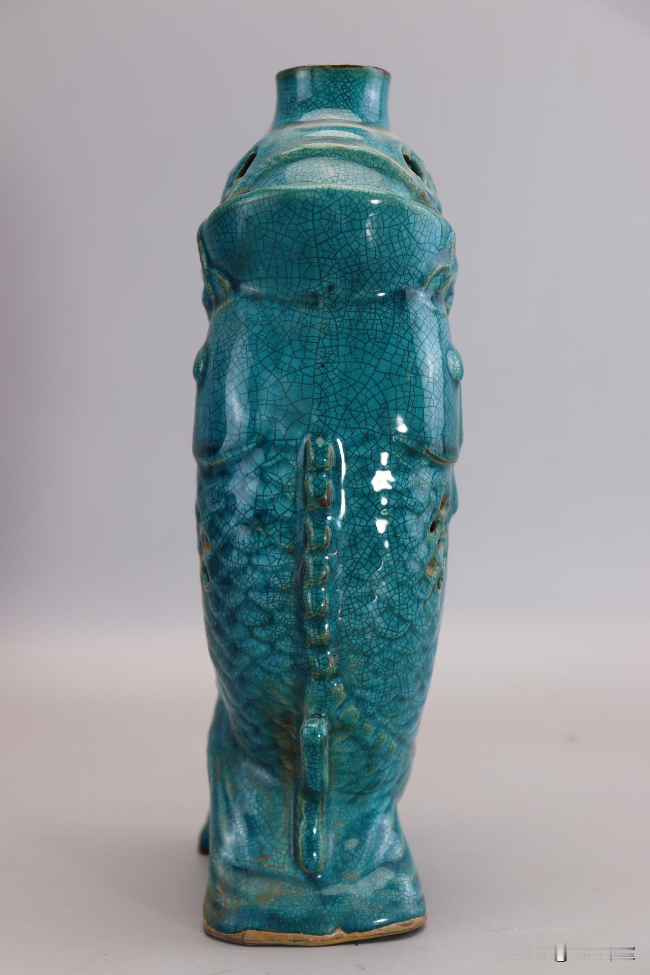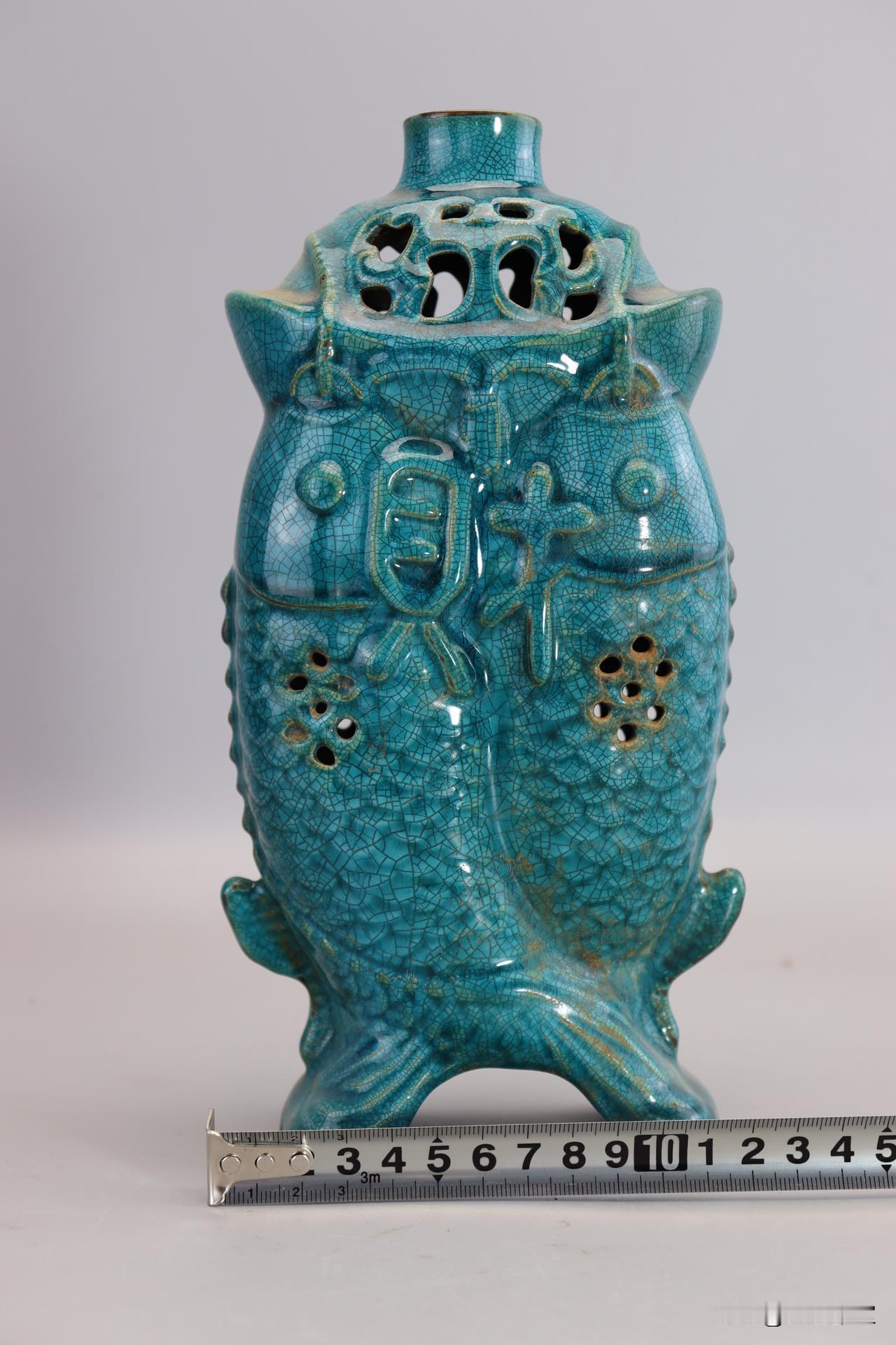 器物通高约25厘米,以双鱼并体为造型,双首相对、鱼尾合抱,腹身满刻细密鱼鳞纹,线条劲挺流畅。通体施孔雀蓝釉,釉色莹润如宝石,遍布自然细碎的开片纹,金丝铁线隐现,是柴窑“青如天、明如镜、薄如纸、声如磬”的绝佳印证。