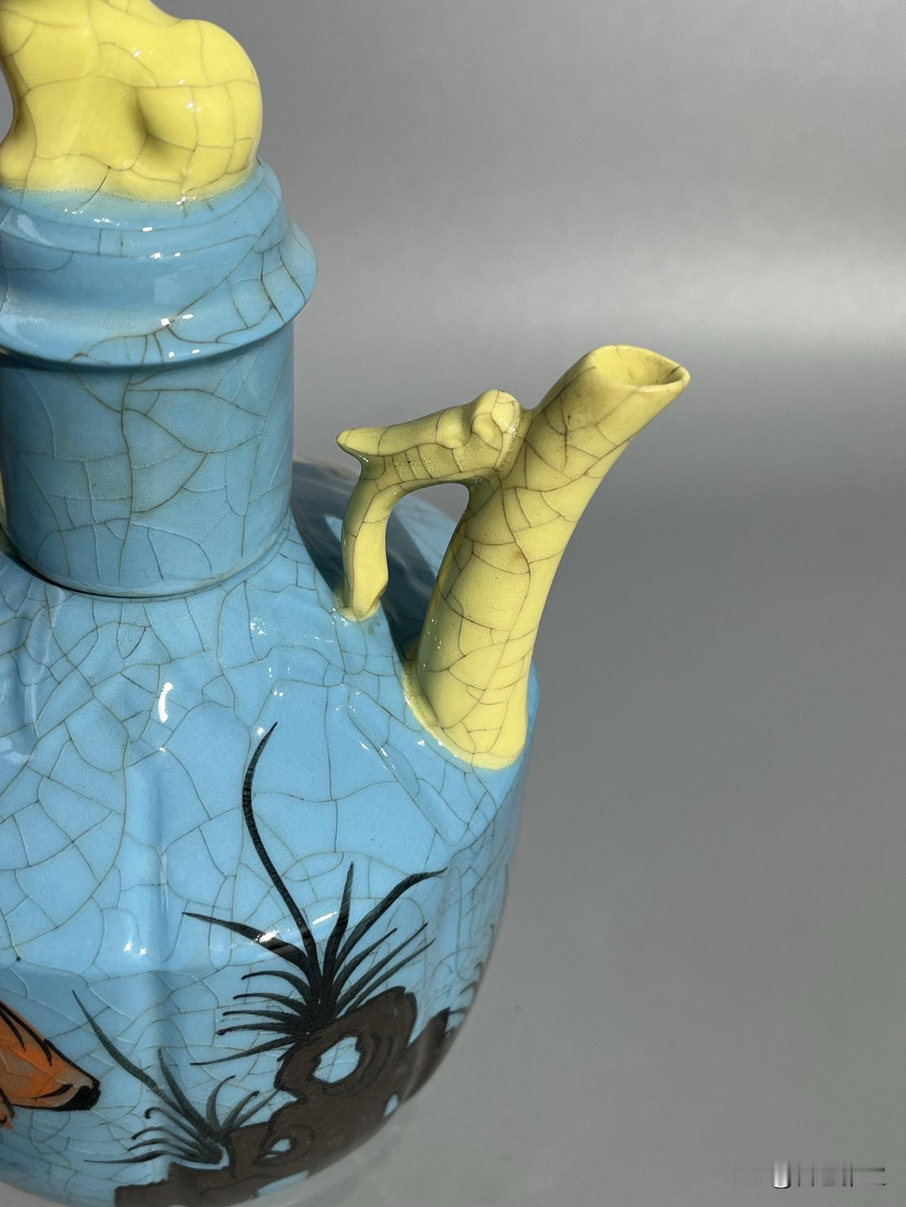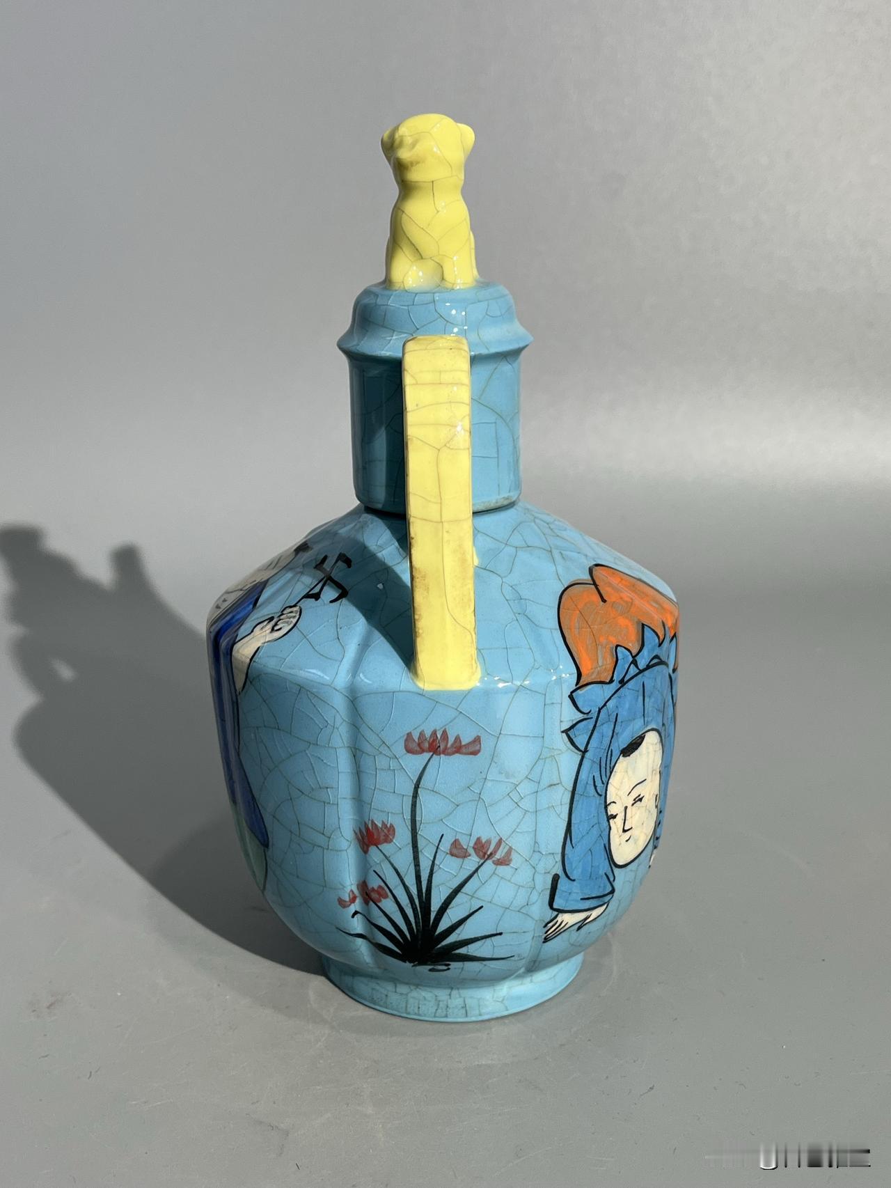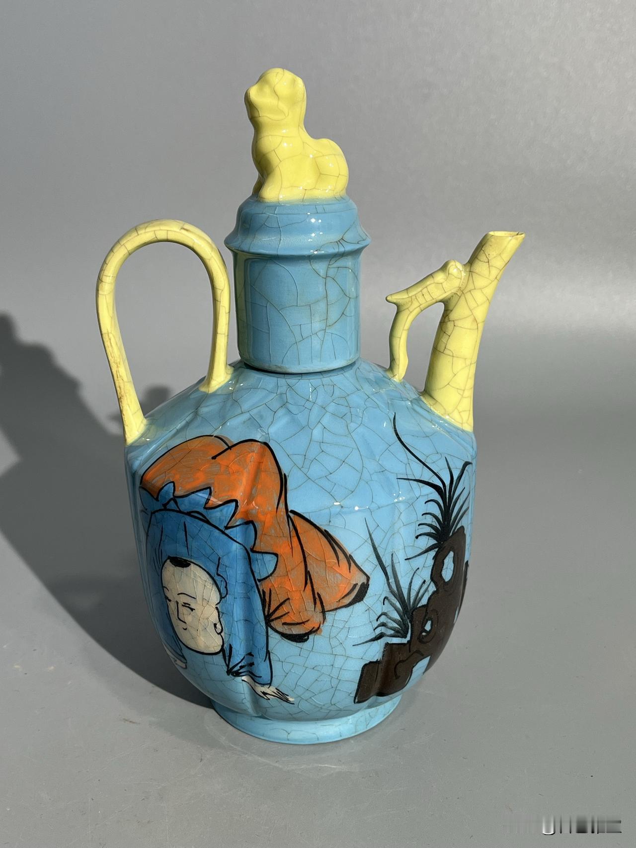 本期为您呈现一件柴窑稀世珍品——“观德元年”凸字印章款天蓝釉开片彩绘婴戏图温酒执壶。此壶通高约22厘米,器型为瓜棱八棱式,线条饱满挺括,是宋代温酒器的经典形制。壶盖塑蹲狮钮,流与执柄为黄釉开片,与主体天蓝釉形成鲜明撞色,开片如冰裂遍布全器,釉面莹润如春水,尽显柴窑“青如天、明如镜”之神韵。