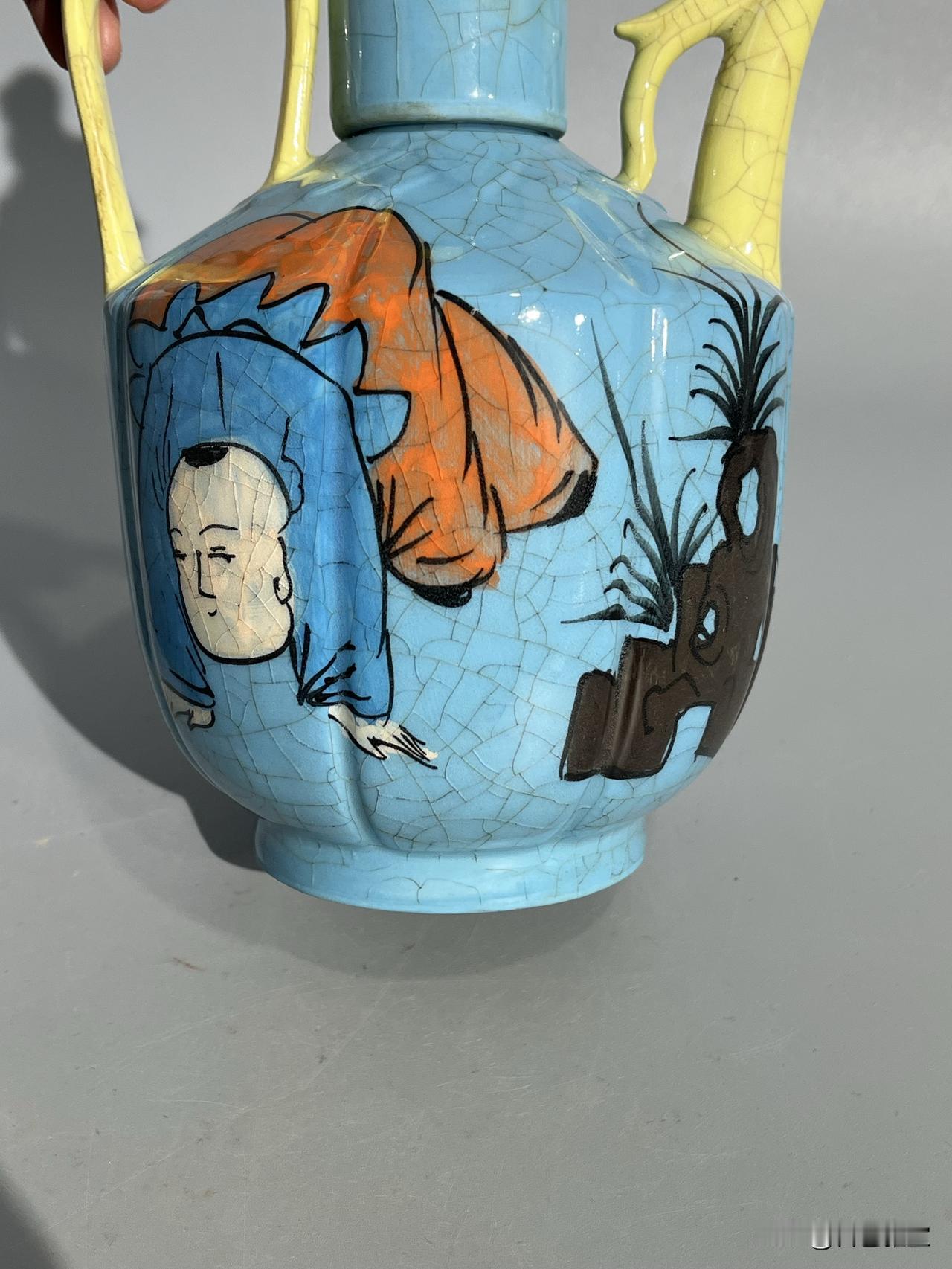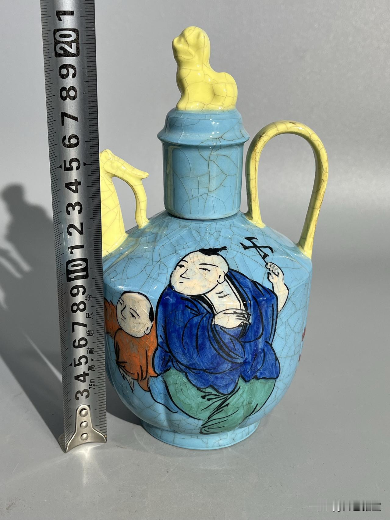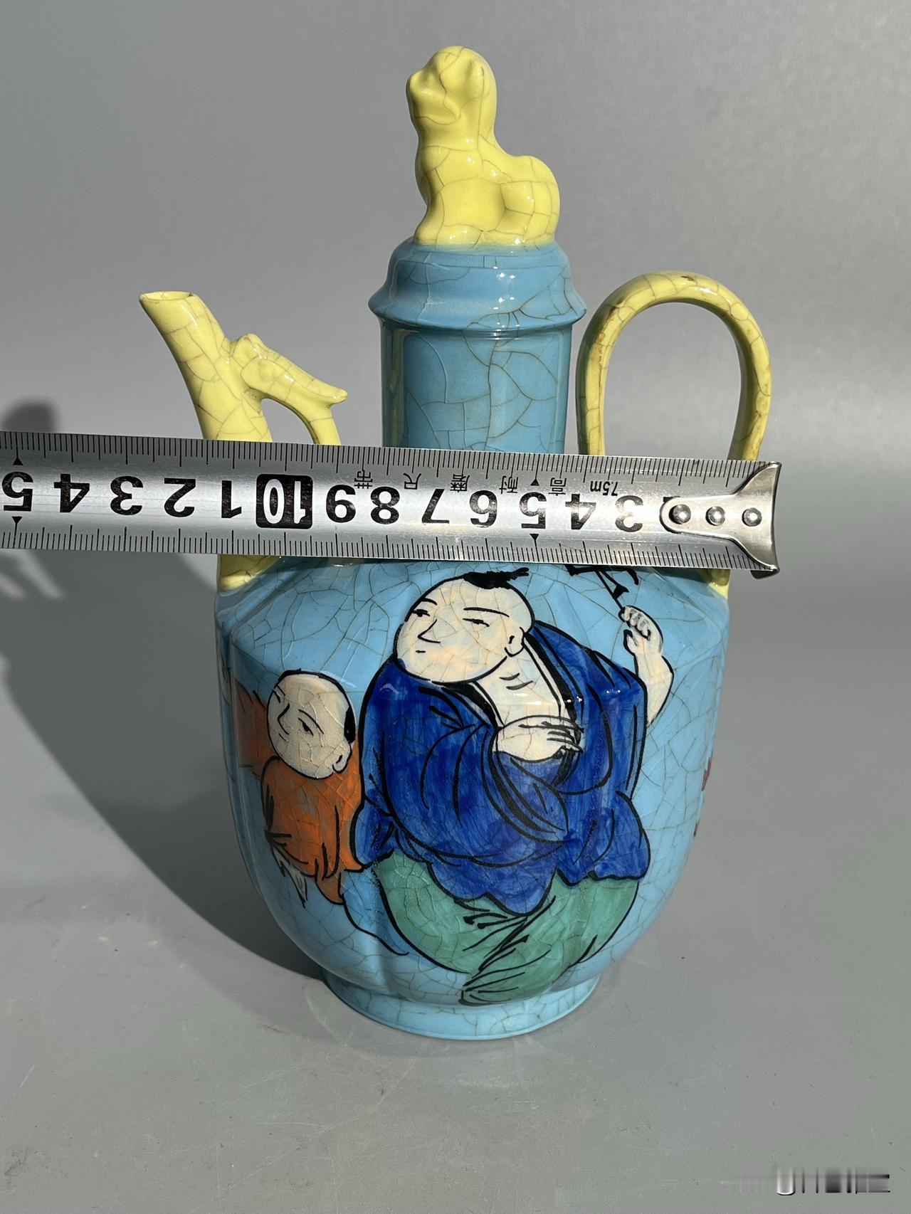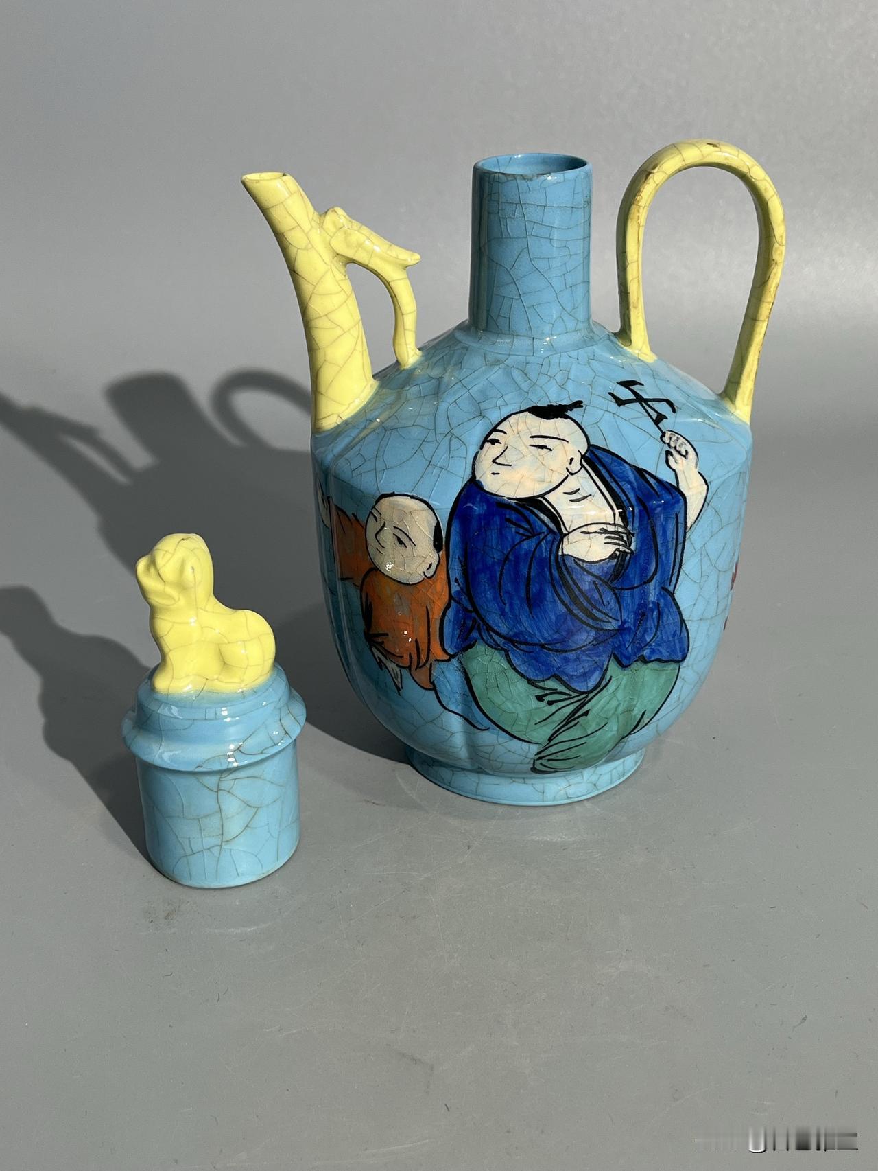 本期为您呈现一件柴窑稀世珍品——“观德元年”凸字印章款天蓝釉开片彩绘婴戏图温酒执壶。此壶通高约22厘米,器型为瓜棱八棱式,线条饱满挺括,是宋代温酒器的经典形制。壶盖塑蹲狮钮,流与执柄为黄釉开片,与主体天蓝釉形成鲜明撞色,开片如冰裂遍布全器,釉面莹润如春水,尽显柴窑“青如天、明如镜”之神韵。
