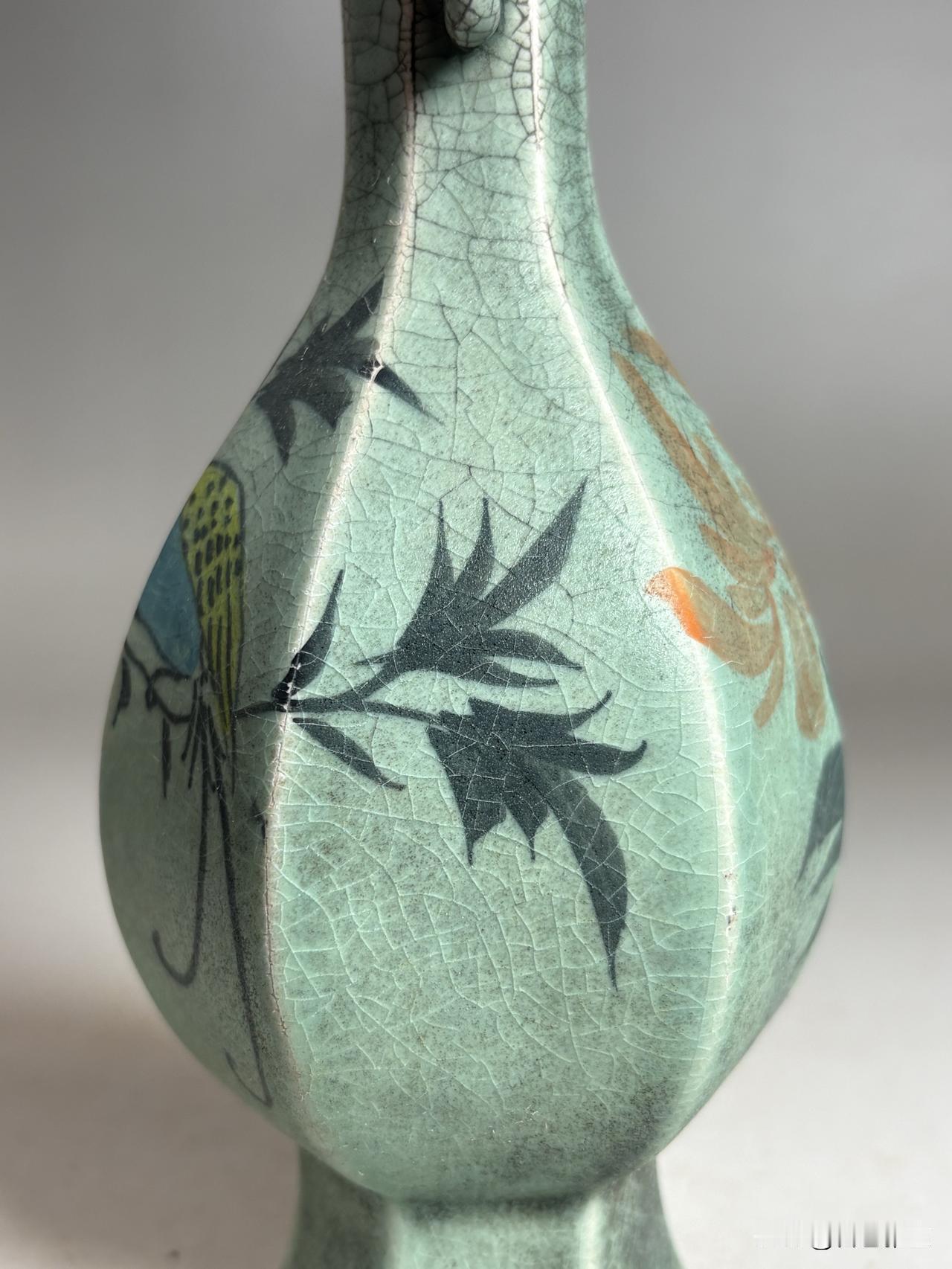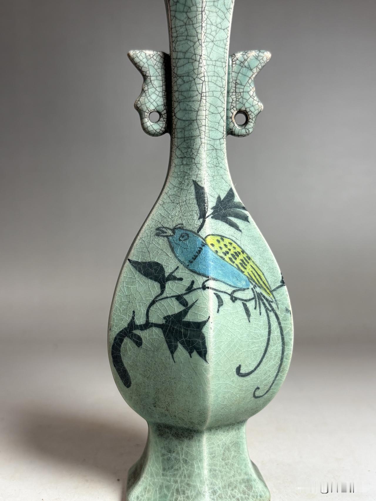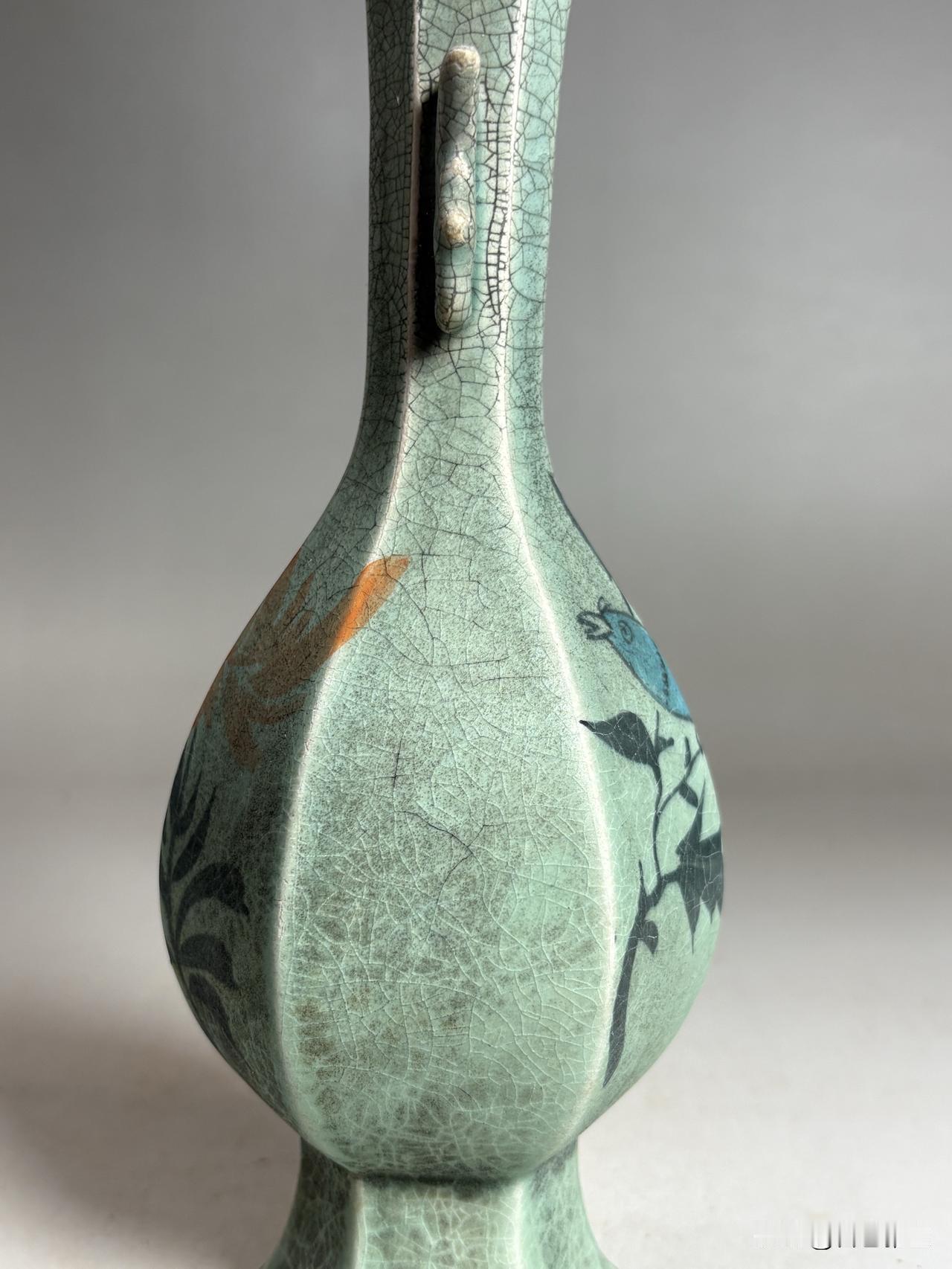此瓶以青釉为底,满布细密冰裂纹,如岁月织就的锦缎,每一道开片都是时光的吻痕。颈部塑出灵动双耳,既添造型之巧,又显工艺之精。瓶身以彩料绘就花鸟:橙黄菊瓣舒展,墨色枝叶劲挺,更有蓝羽灵禽栖于枝头,顾盼生姿,生机盎然。六面纹饰各异,或写花之盛放,或绘鸟之悠然,笔意洒脱,意趣天成。