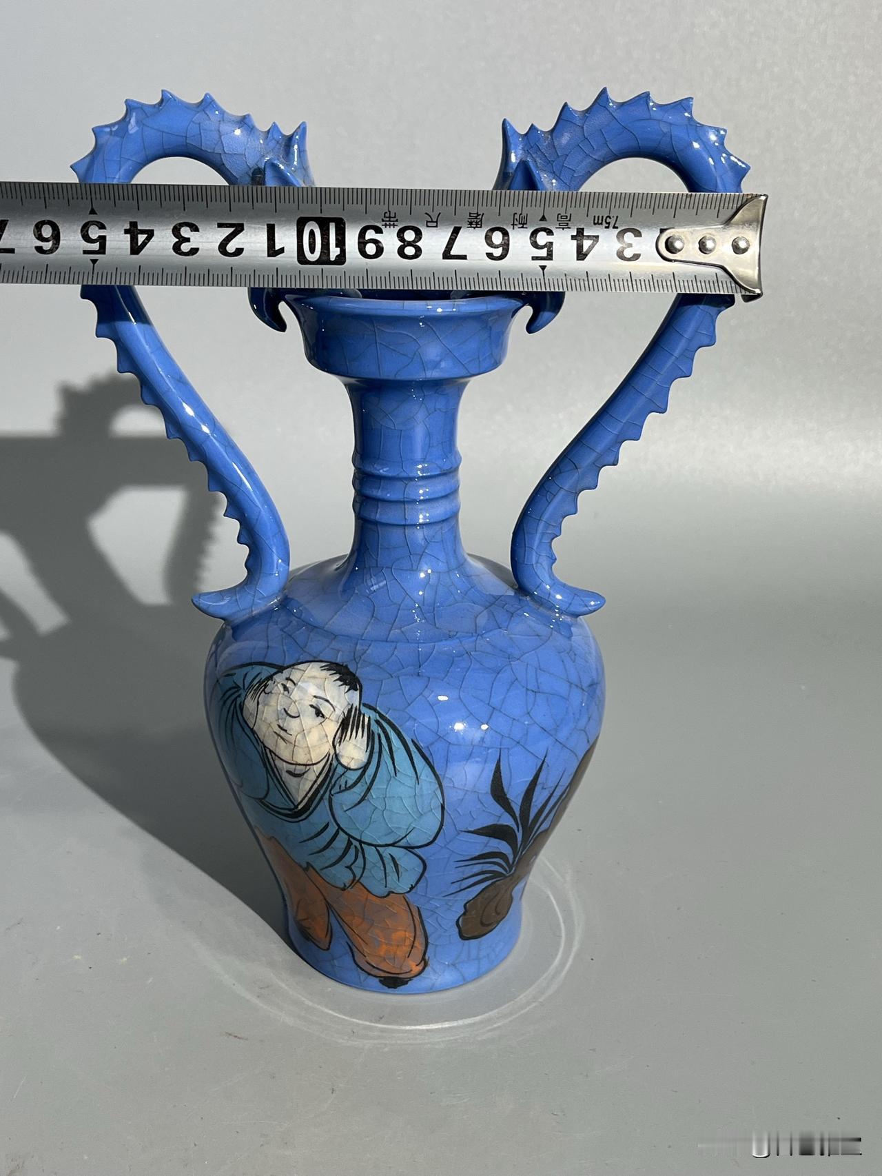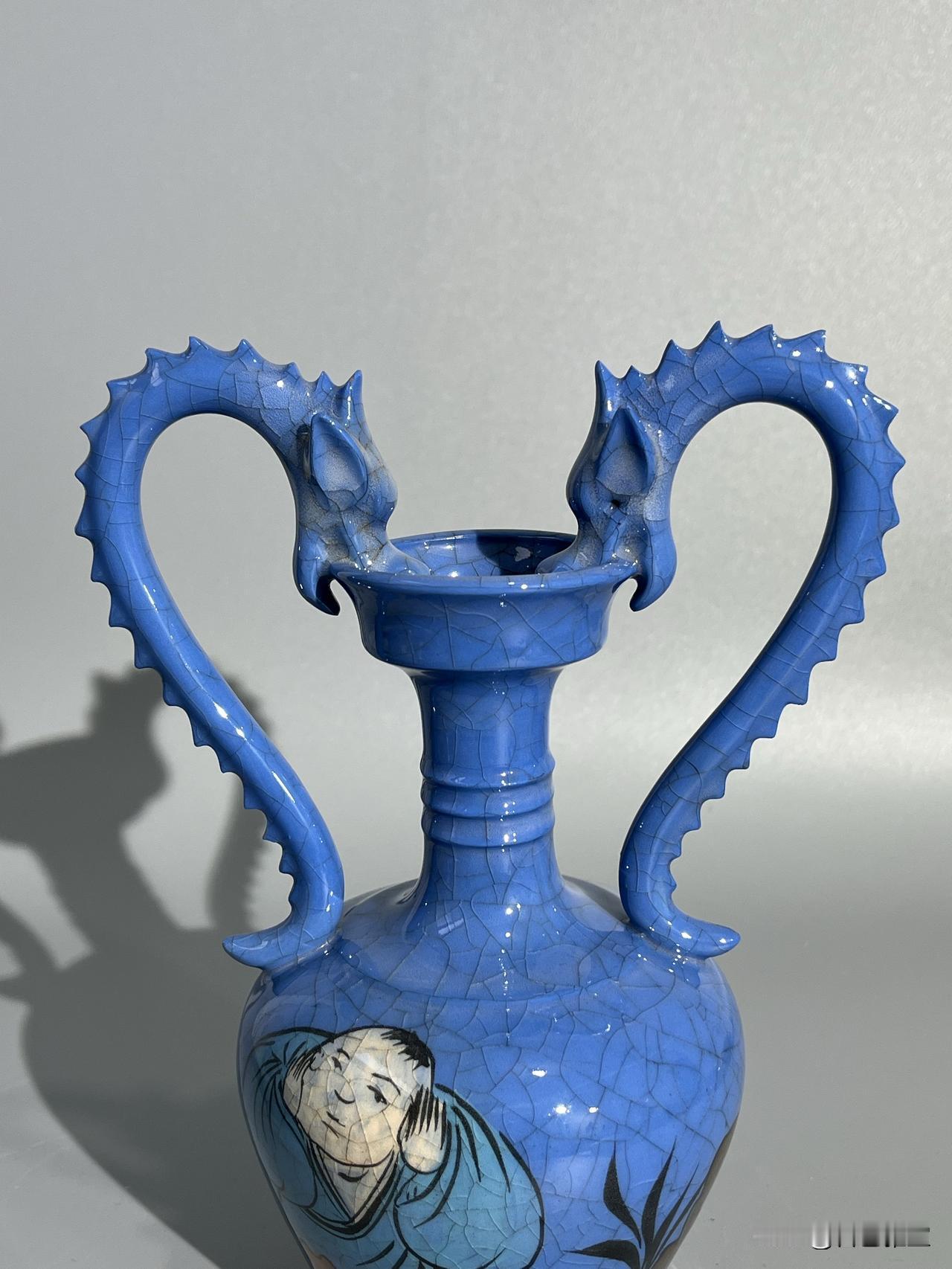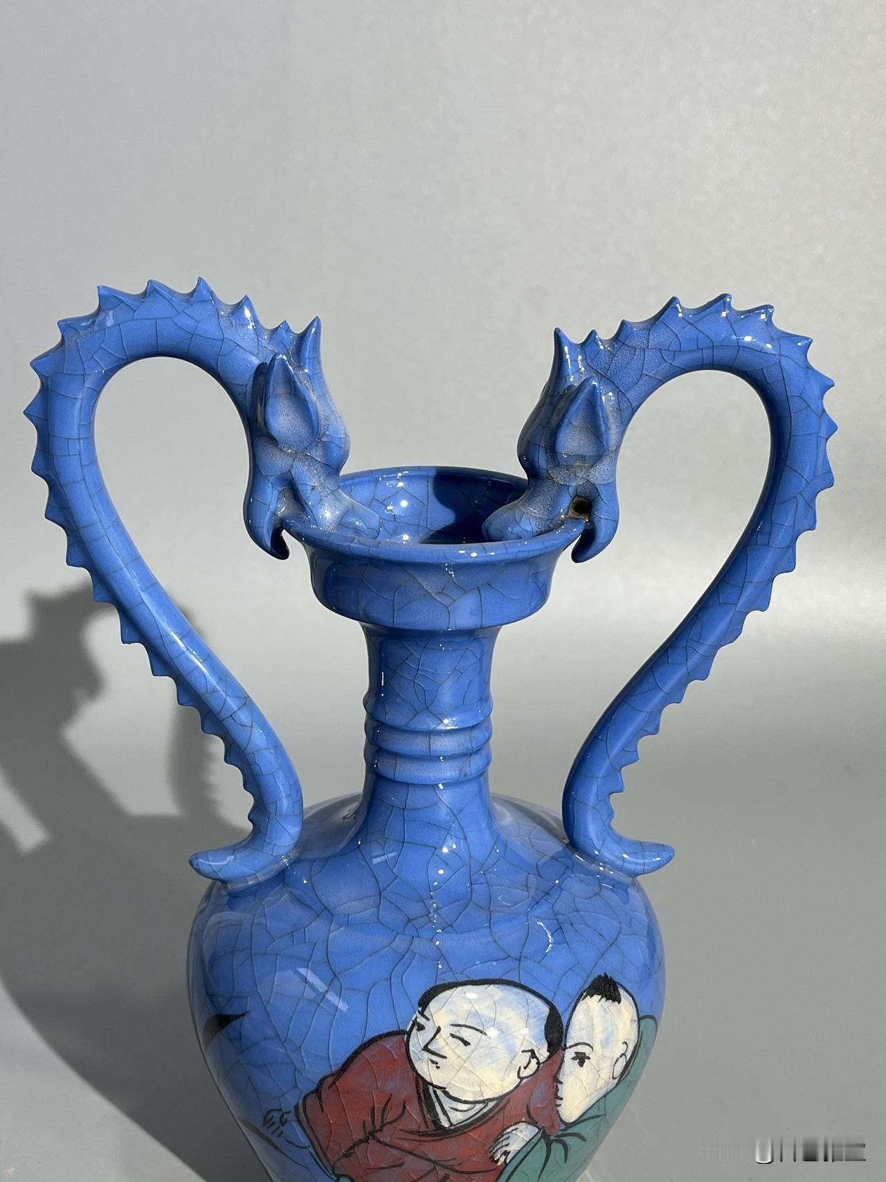 五代柴窑蓝釉开片婴戏双龙耳瓶