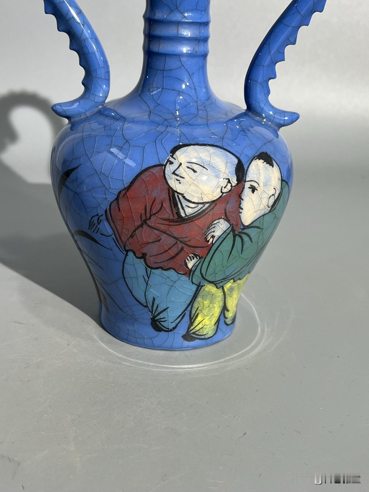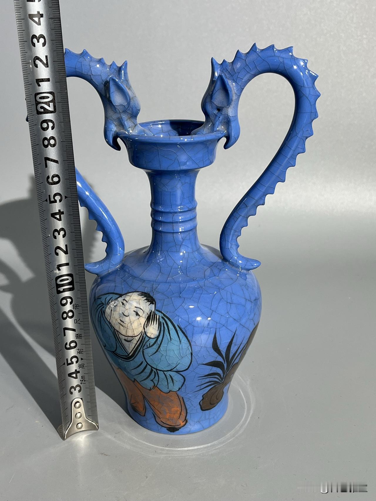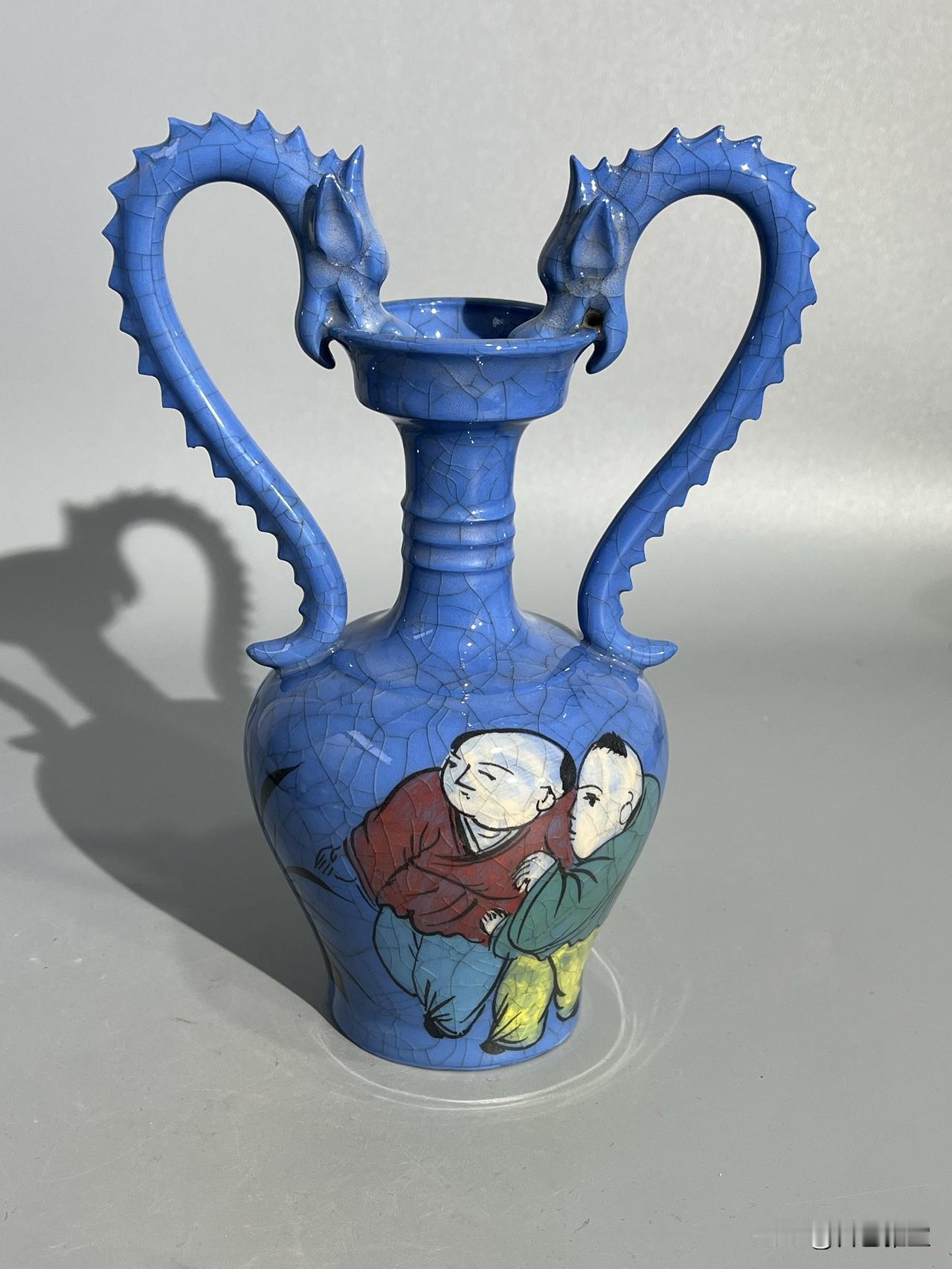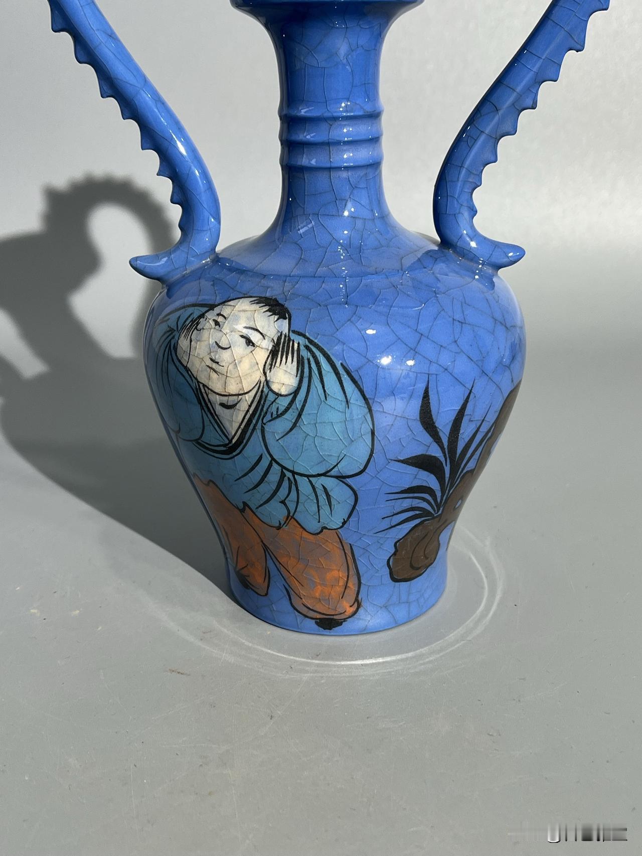五代柴窑蓝釉开片婴戏双龙耳瓶