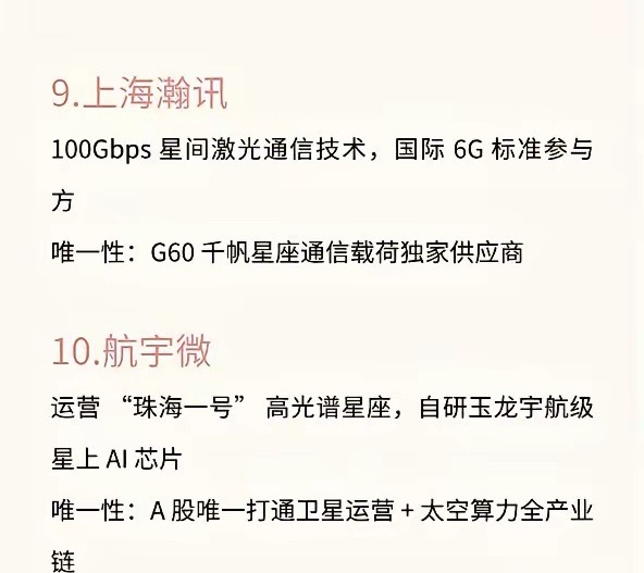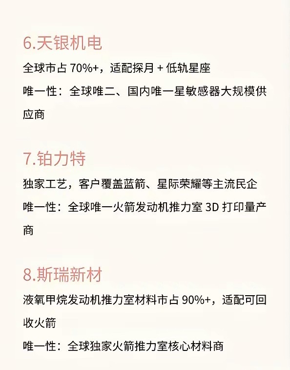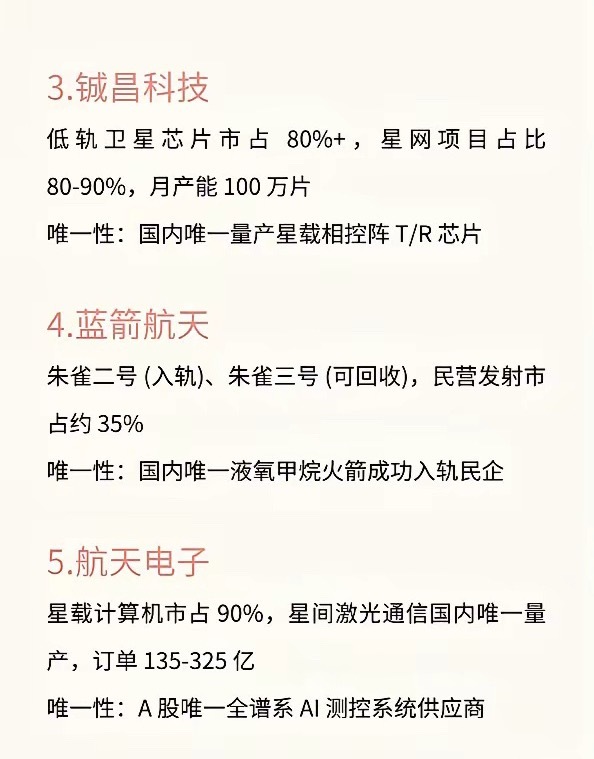 商业航天具备唯一性的十家公司1.中国卫星国内 70% 民用卫星制造,承接星网 / G60 千帆 60% 订单,海南基地年产能 900-1000 颗唯一性:A 股唯一整星总体制造龙头2中国卫通稀缺同步轨道资源,19 颗商用卫星,覆盖全球 95% 人口区唯一性:国内唯一高轨商用卫星运营资质3.铖昌科技低轨卫星芯片市占 80%+,星网项目占比80-90%,月产能 100 万片唯一性:国内唯一量产星载相控阵 T/R 芯片4.蓝箭航天朱雀二号 (入轨)、朱雀三号 (可回收),民营发射市占约 35%唯一性:国内唯一液氧甲烷火箭成功入轨民企5.航天电子星载计算机市占 90%,星间激光通信国内唯一量产,订单 135-325 亿唯一性:A 股唯一全谱系 AI 测控系统供应商6.天银机电全球市占 70%+,适配探月 + 低轨星座唯一性:全球唯二、国内唯一星敏感器大规模供应商7.铂力特独家工艺,客户覆盖蓝箭、星际荣耀等主流民企唯一性:全球唯一火箭发动机推力室 3D 打印量产商8.斯瑞新材液氧甲烷发动机推力室材料市占 90%+,适配可回收火箭唯一性:全球独家火箭推力室核心材料商9.上海瀚讯100Gbps 星间激光通信技术,国际 6G 标准参与方唯一性:G60 千帆星座通信载荷独家供应商10.航宇微运营 “珠海一号” 高光谱星座,自研玉龙宇航级星上 AI 芯片唯一性:A 股唯一打通卫星运营 + 太空算力全产业链干货不藏着,常来看看,看到就是赚到仅为个人记录,不作为任何建议
