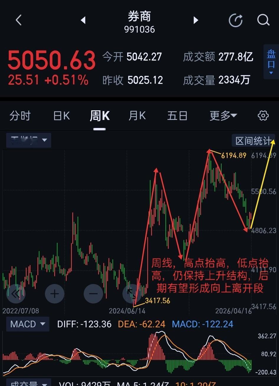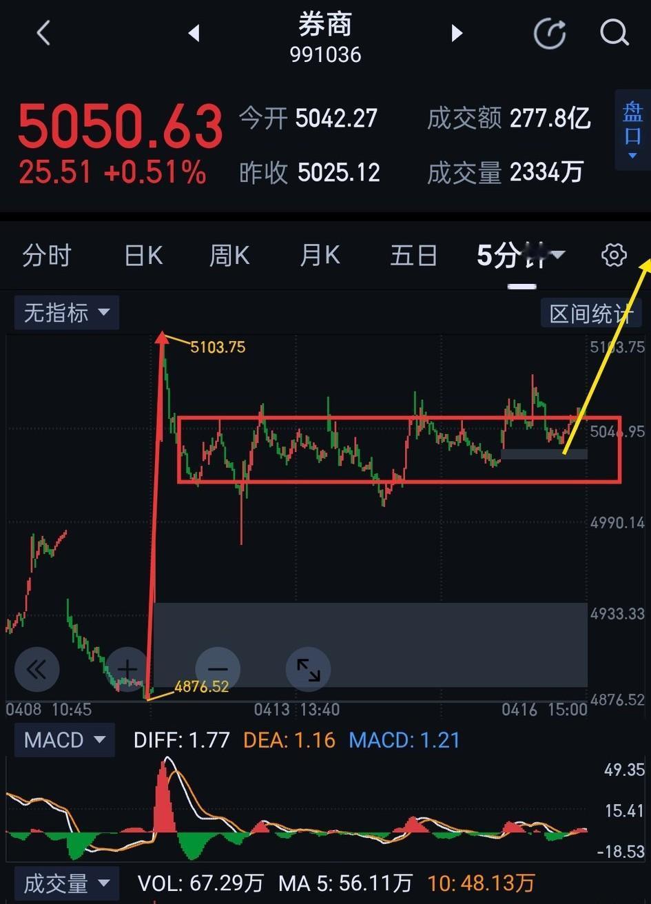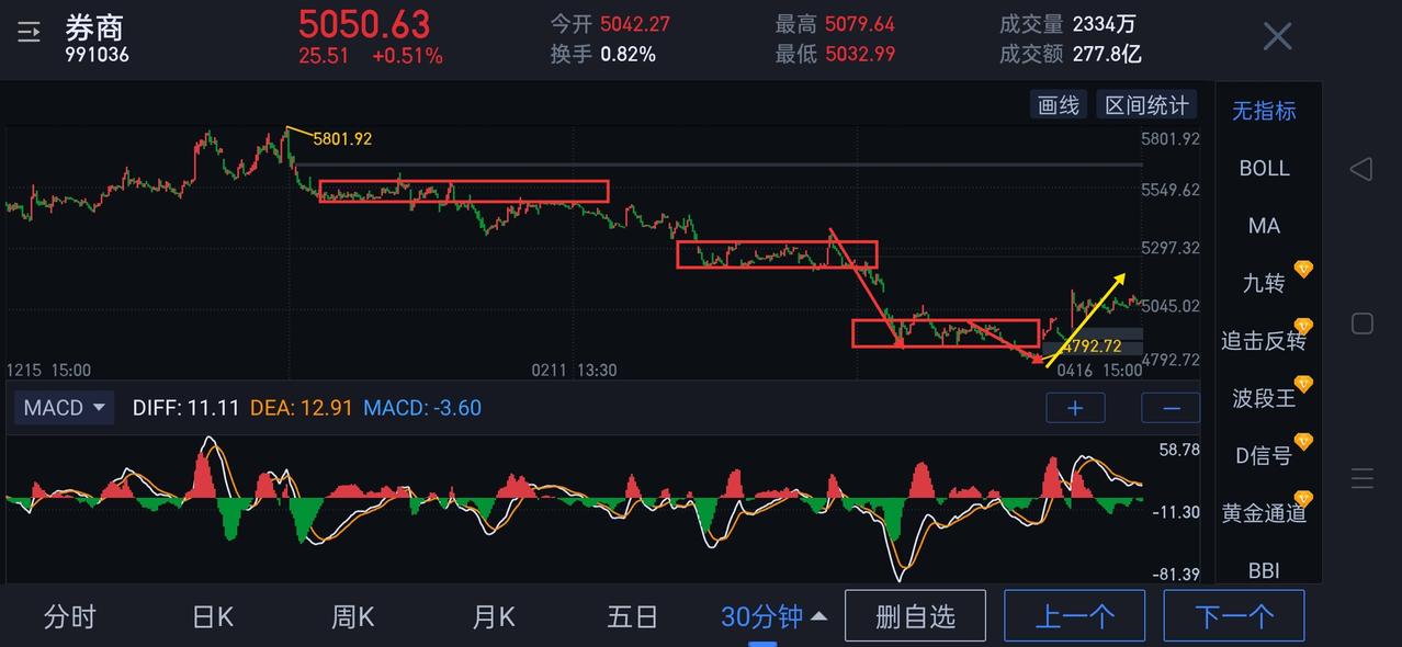 券商板块,明天有望加速上行。 券商,自4月7日形成阶段低点后,近几日始终维持横盘震荡。多、空围绕图(1)中枢展开激烈争夺。空方反复发力,始终不能形成向下突破,这有效消耗了空头向下动能。此处可视为多方在构筑防线,为后续上攻奠定基础。 券商明天围绕图(1)中枢上沿5052 应该会有适当博弈。可观察5052能否有效站稳。站稳,将摆脱近期震荡,形成图(2) 一分钟中枢的向上离开段,后期需观察是否能摆脱盘整背驰的影响。若不能站稳5052,后市只要不形成该中枢的三卖,暂用中枢震荡的视角跟随。 券商板块,在经历了图(3)连续三个五分钟中枢的趋势性下跌后,在4792形成背驰,调整不可谓不充分,再叠加年报业绩支撑,A股慢牛加持,部分个股破净,券商个股价值低估,将迎来再次重新定价。券商此处形成反转的概率极大 ,且行且珍惜吧!(图中黄色线段属于待确认走势)