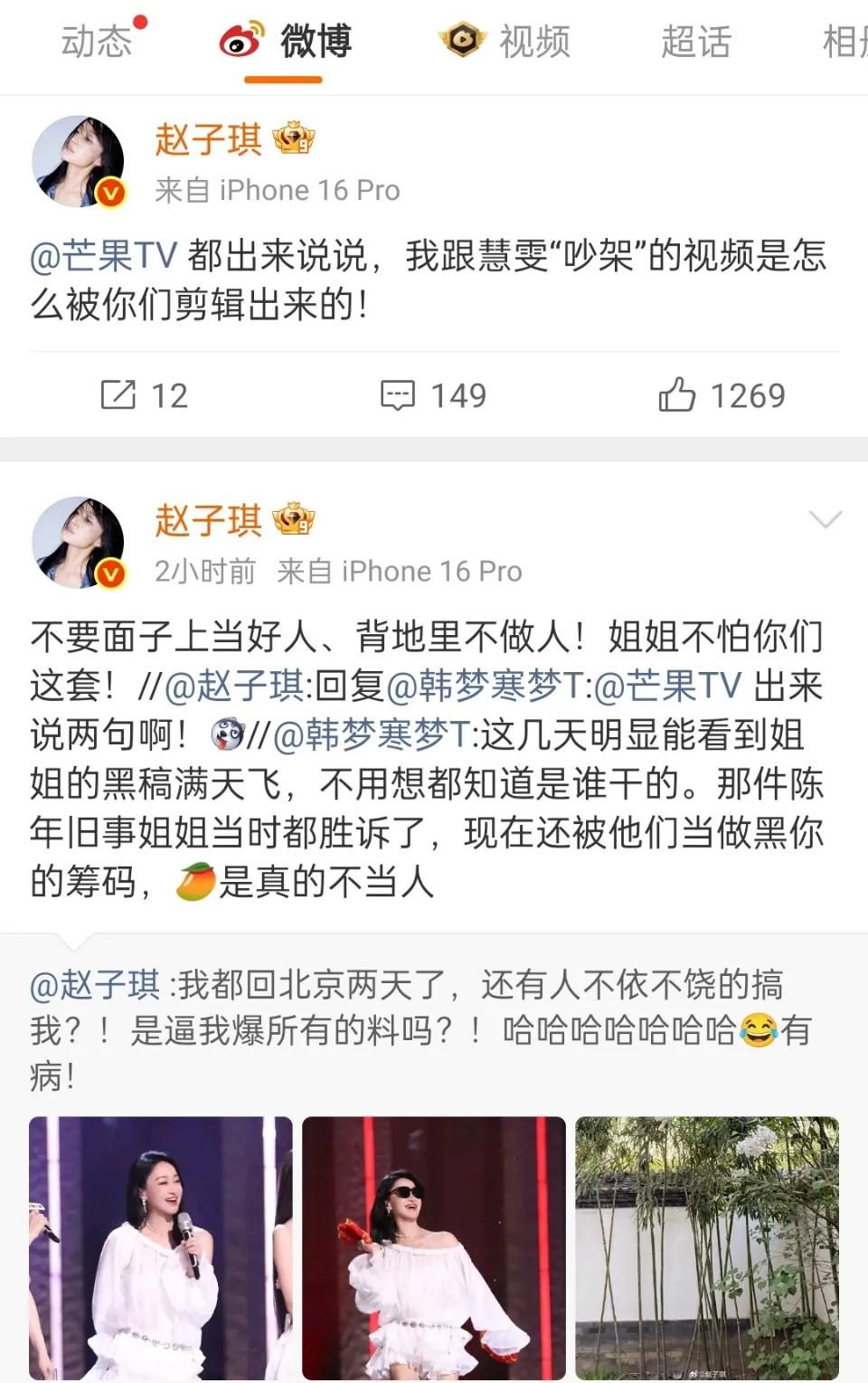 连发多条微博质问芒果TV:“我都回北京两天了,还有人不依不饶地搞我?是逼我爆所有的料吗?”随后,她转发了网友评论并配文:“芒果TV出来说两句啊!不要面子上当好人,背地里不做人。”