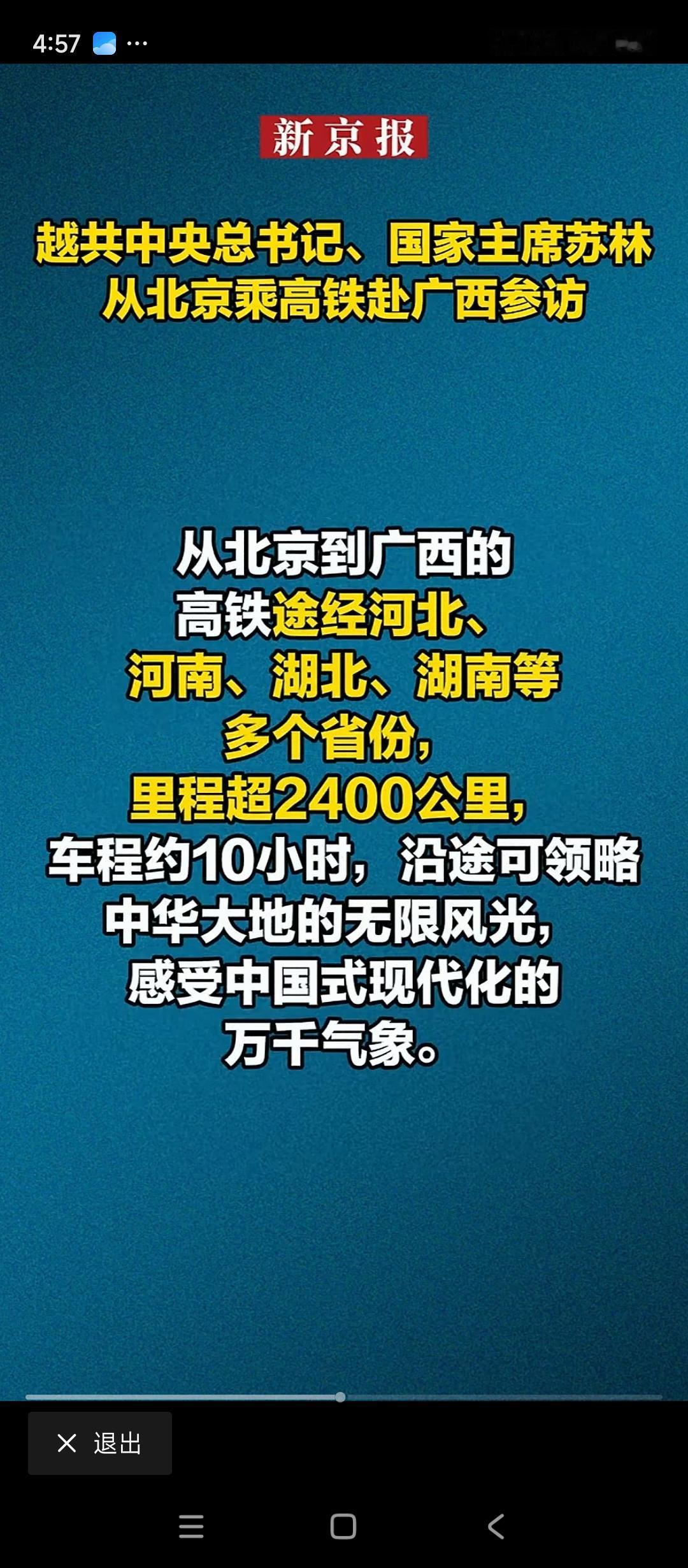 苏林在中国坐高铁,坐上瘾了!返程北京到广西还是高铁,车程10小时,这么大年纪,还带着越南代表团,不是不怕累,而是这次本来就是,为考察体验中国高铁而来!