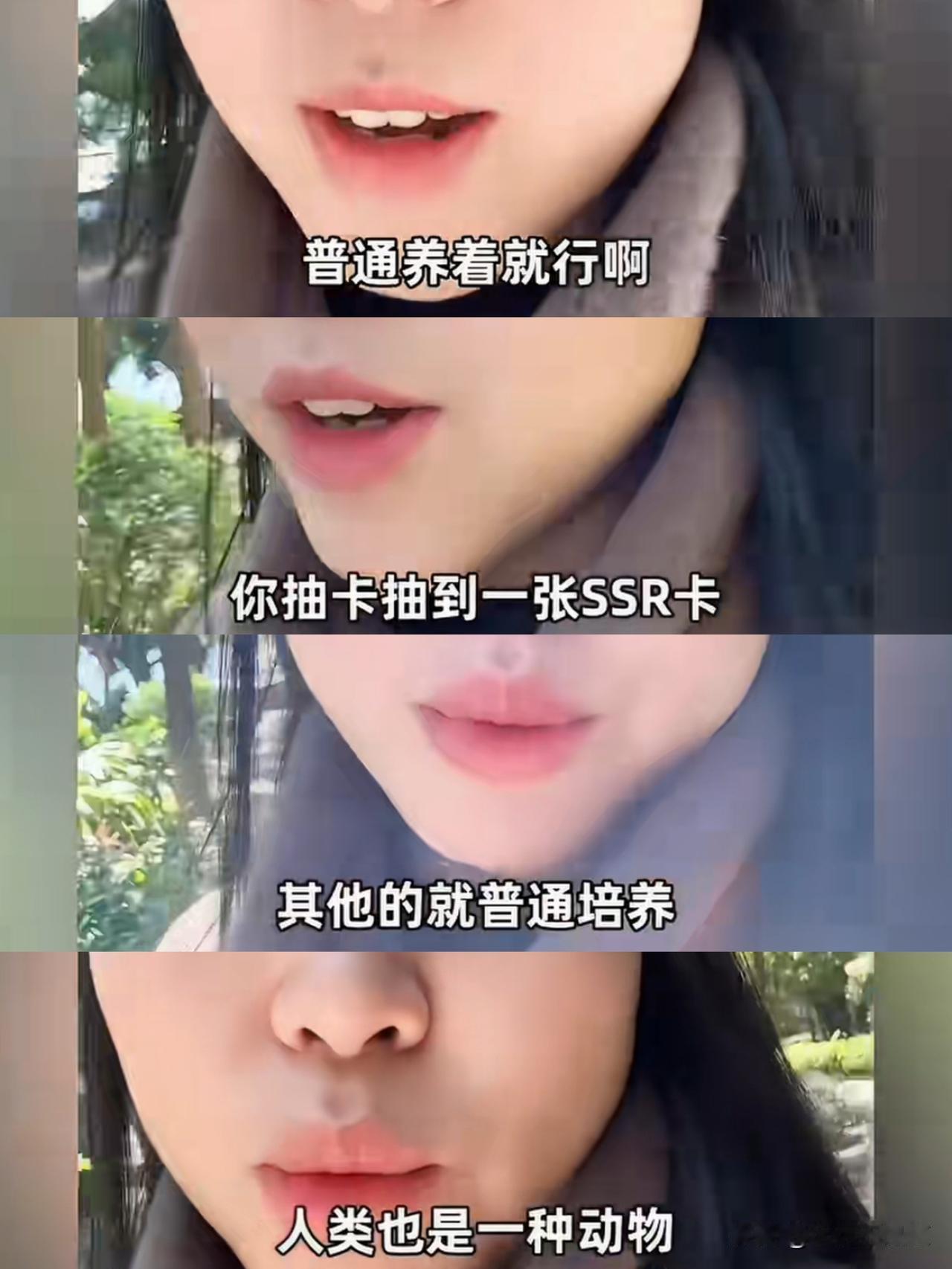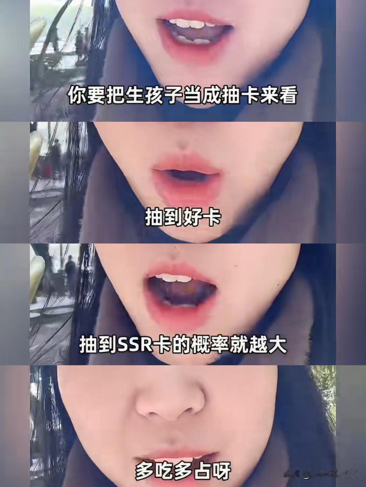 第一次听到有人把生孩子当成抽卡!这个女人她说人类最终也是一种动物,那要相信一动物学,要相信概率学,所以你只要多生孩子,那么你就相当于抽卡的概率就越大,你生的越多,那么抽到金卡,SSR卡的概率就越大!她生了5个孩子,她认为生孩子就是对人生最大的投资,只要生的够多,那么抽卡的几率获得ssr卡的概率就更大!有人问那5个孩子,你怎么养的好呢?她说不用担心用心养,不用报班,普通养着就是了,只要但凡有一个孩子能够拿到金卡或者SSR卡,那就成功了!至于其他的孩子,没有任何关系!因为人类的本质它也是一种动物,所以要相信概率学!这位女性还说如果你什么本事都没有,那你就去做生孩子,多吃多占啊,多占的社会资源嘛,多占到社会资本之后你就能够多有一些概率啊,那么你抽到金卡和SSR卡的概率就更大呀,所以一定要多生孩子!我怎么感觉她文化程度挺高的,认知也高,可是,可是,怎么说的话歪七八里的!孩子在她眼里只是有价值的物品,而不是一个人,所以她每一个都不爱,她只爱那个未来可能给她带来最大效益的那个。时代不一样了,老一辈都穷,靠力气奋斗都能赚到钱,现在累死你也就顾个温饱。以前一个村出不了一个大学生,现在遍地都是大学生。怎么一点都不知道进步还用老眼光看新时代呢?就算你说的只要一个人中龙凤就能够算是成功,可是你没有想过凭什么人家就要一个人来扛下一大家子人的责任,全部所有人来趴着这一个人吸血呀!还说成功,那是叫成功吗?那个叫寄生虫!生孩子变成了股票基金,可以是任何一样能投资的商品,唯独不是有温度的人。有句古话说的好,烂泥扶不上墙。还有一句话叫做龙生龙,凤生凤啊!你要期待能够抽到金卡,SSR卡,那你只能期待一个东西,那叫做基因突变,你这不是生5个的问题啊,你得生500个!