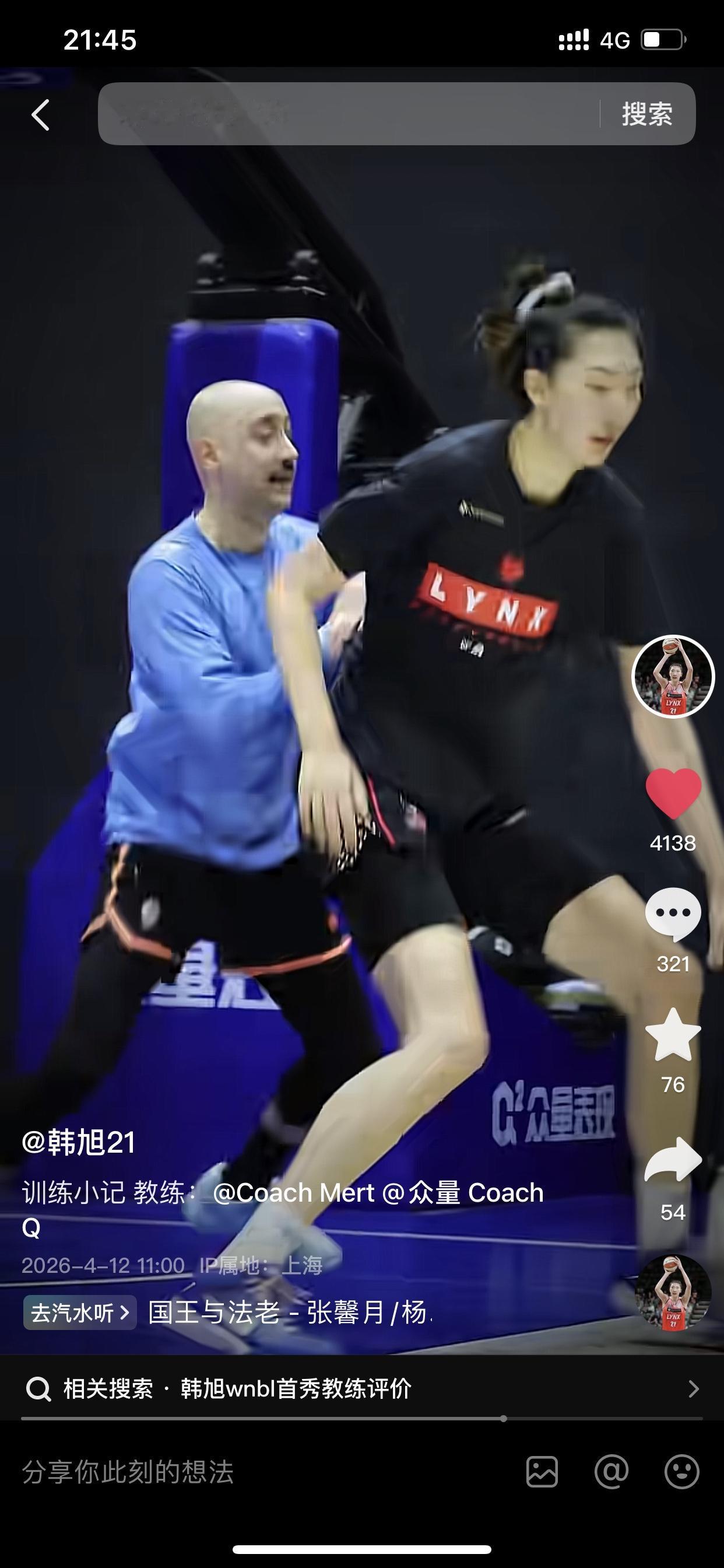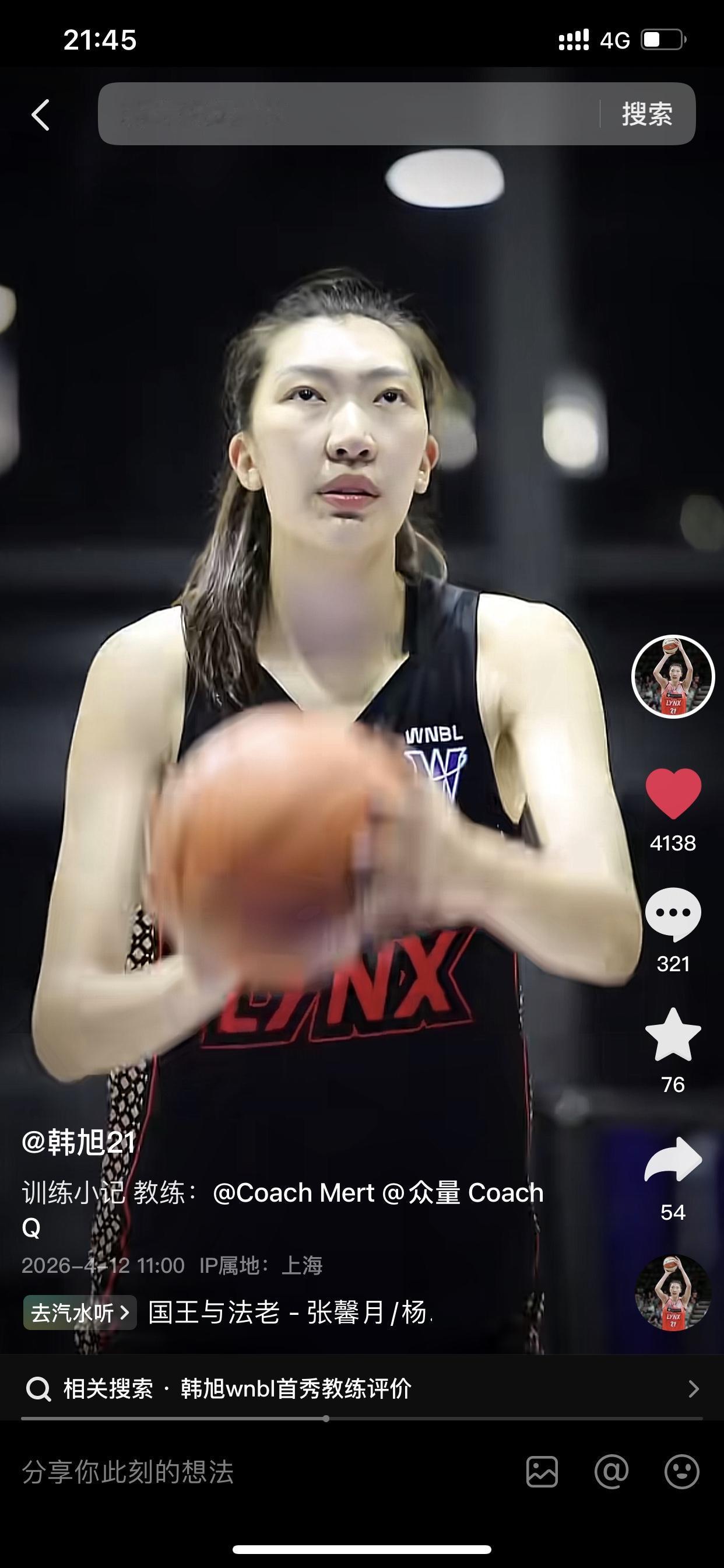 通过韩旭的个人抖音账号可以发现,韩旭在结束国家队任务之后,只是休整了两三天,就直接进入到努力的训练当中去了,她近期都是在上海某个篮球训练中心,特意聘请了训练师等专业人士,为自己进行篮球技术的训练,以保持自己的竞技状态