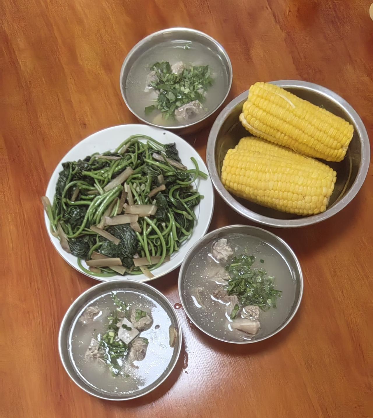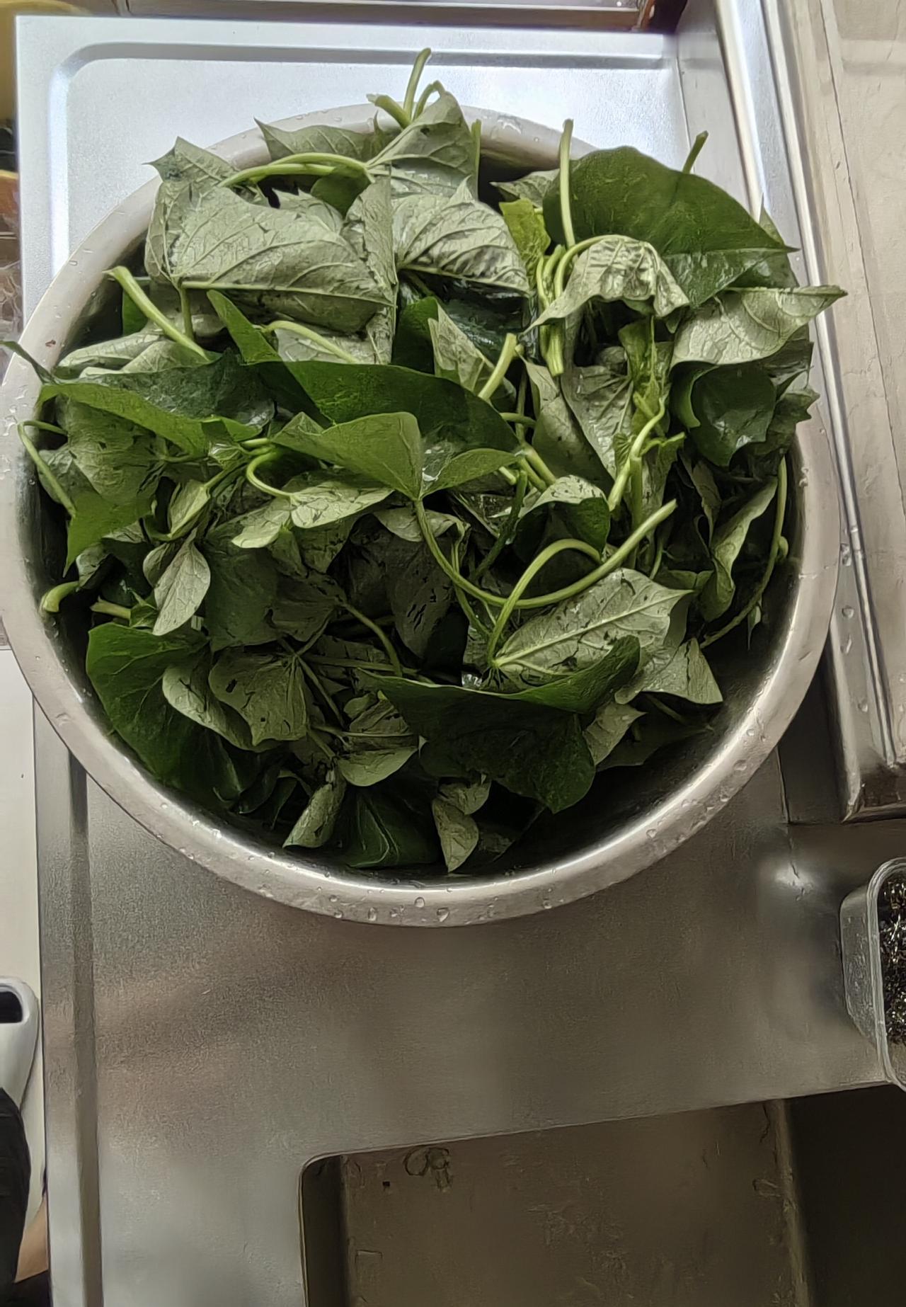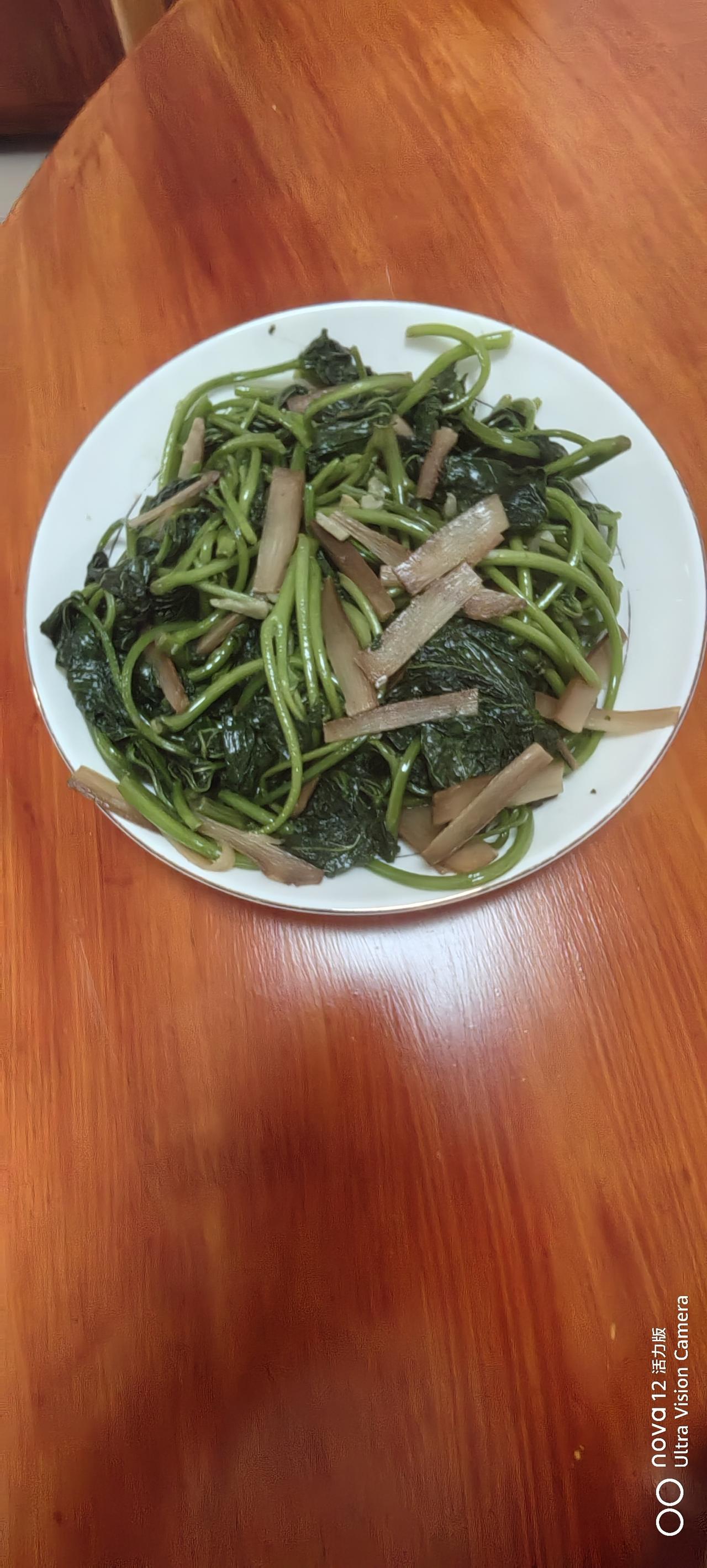 广西省级别的荤菜扣肉、白切鸡。省级别的素菜红薯叶,北方人当初嘲笑广西人把猪菜当青菜,其实他们都不知道广西人吃的红薯叶是那种不结红薯的品种,是一种专门摘红薯叶的品种,而且广西人炒红薯叶有专利,蒜米、干辣椒、酸笋是最佳搭档,先把蒜米干辣椒爆香加入酸笋炒出味道,再把红薯叶下锅一同炒熟,下油足够就会色泽清秀(我炒的因为油少)早餐一如既往的简单营养,中餐主打方便,转眼岳母来我家已经半年,有点乐不思蜀了,大橘说你想写字先抱抱我[捂脸][捂脸][捂脸]
