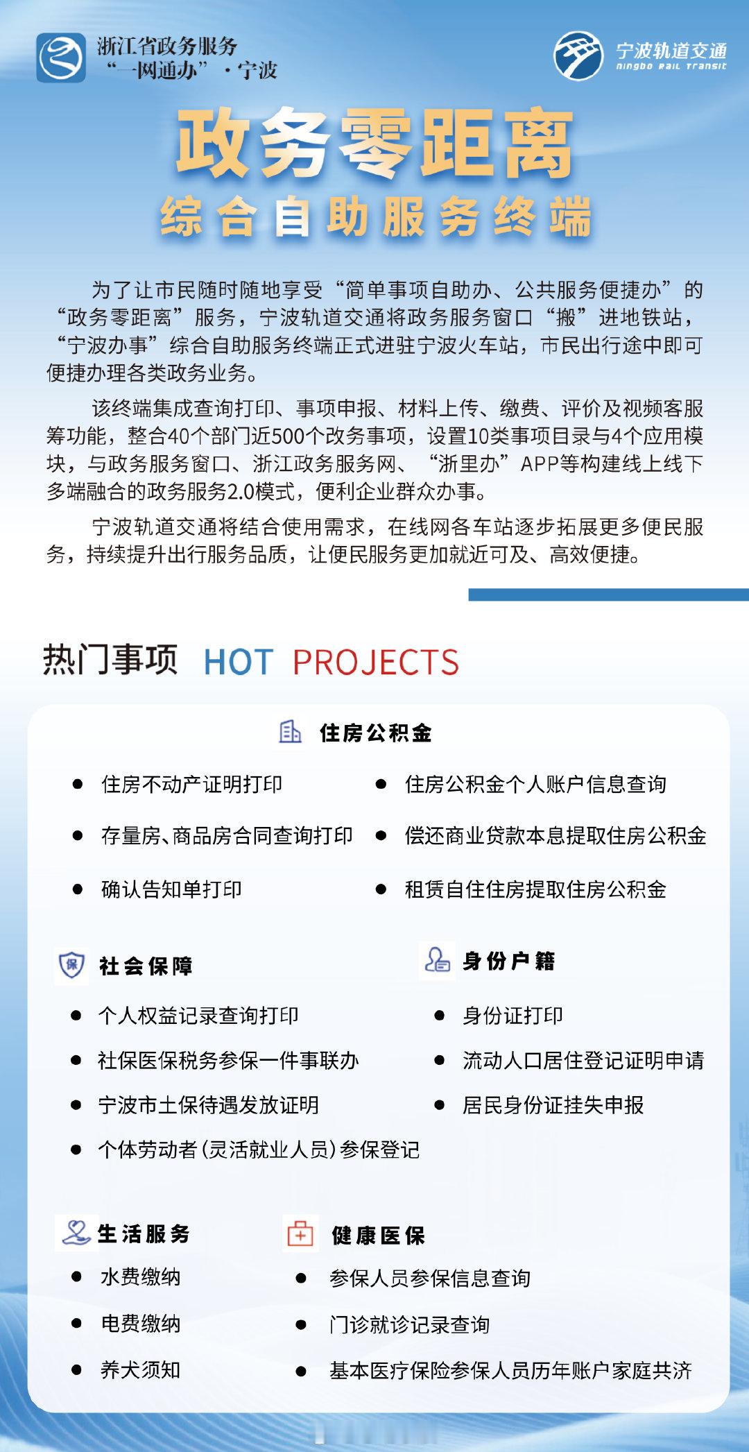 宁波地铁站上线政务服务也太方便了 宁波地铁将政务服务引入站点,“宁波办事”综合自助服务终端已进驻宁波火车站、福庆北路站、鼓楼站3个地铁站。该终端整合40个部门近500项高频政务事项,涵盖人社、医保、公积金、公安等,设六大功能板块与四大应用场景,支持证明打印、在线缴费、视频客服等全流程服务,实现多端协同、跨省通办。市民通勤候车即可办理业务,操作简便、省时高效,获广泛好评,极大提升便民服务效率。(综合宁波地铁运营、宁波发布)暖心浙江同城热点创作计划