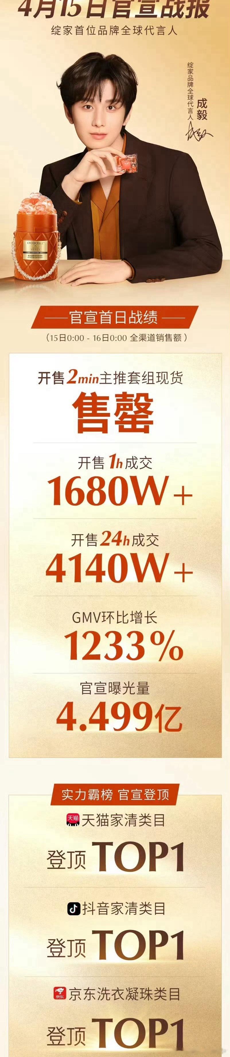 成毅绽家代言首日战报来了,开售1小时成交1680W+,开售2分钟主推套组现货售罄,环比增长1233%,截止当日0点成交4140W+,这才14小时,而且战报全部是成交金额,非GMV!作为日化品牌实在也太伟大吧!官宣曝光量 4.499亿 ,登顶天猫、抖音、京东多平台销量榜单榜首,星品破亿断层第一,销量声量双顶,夯爆了!成毅这个带货能力和号召力,不愧是稀缺的财顶!成毅绽家首位品牌全球代言人
