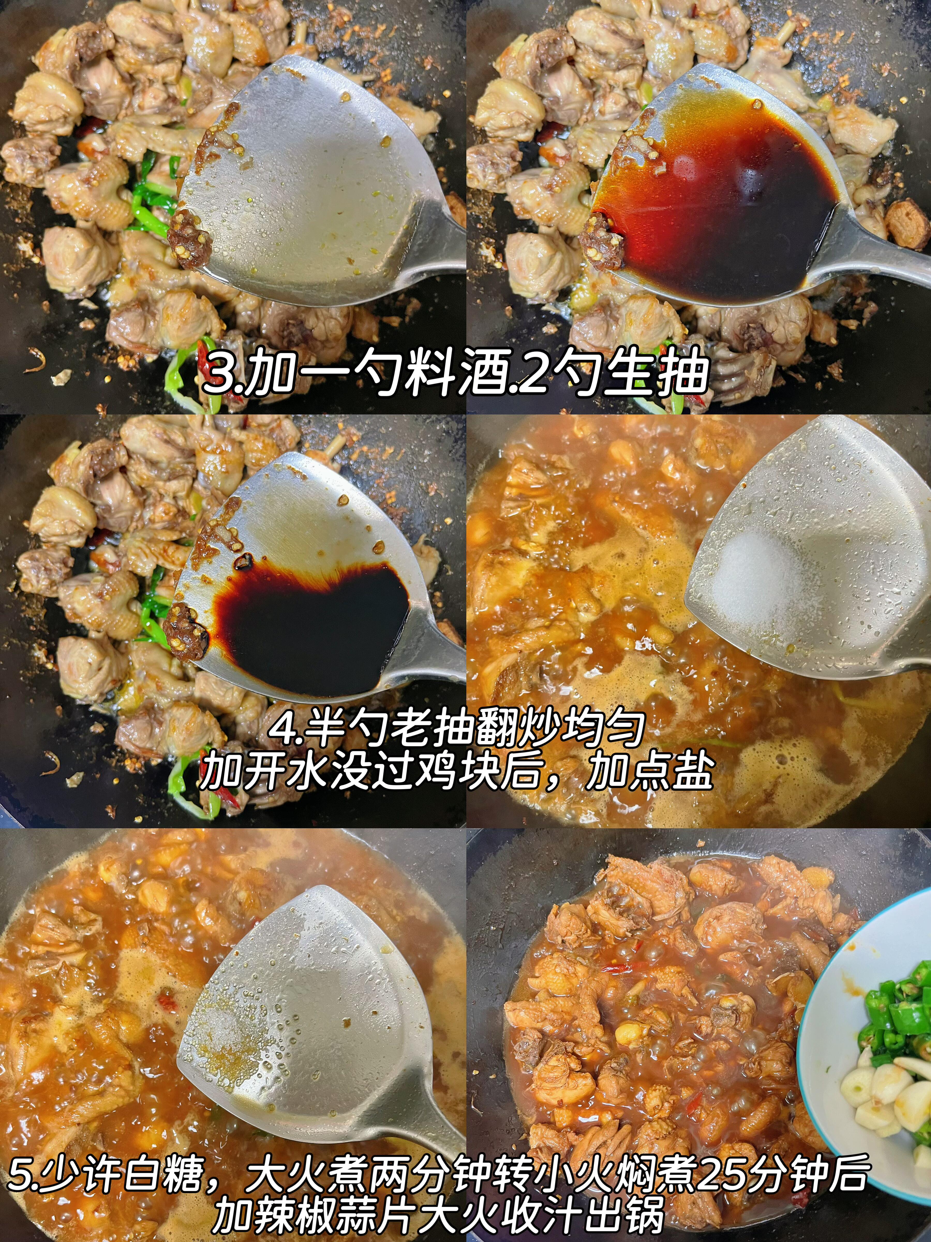 6️⃣ 最后放入新鲜辣椒和蒜瓣,转大火收汁,翻炒到汤汁浓稠,紧紧裹住每一块鸡肉,关火就能出锅啦!