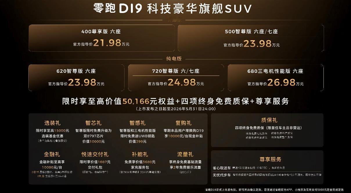 【千呼万唤始出来,零跑DA9正式上市,21.98万起】日前,零跑旗舰D平台首款车型零跑D19正式上市,新车定位科技豪华旗舰SUV,售价21.98-26.98万元。作为零跑全域自研,核心零部件自研自造占比超65%,历经十年沉淀打造的大成之作,零跑D19自亮相之初就颇受期待。
