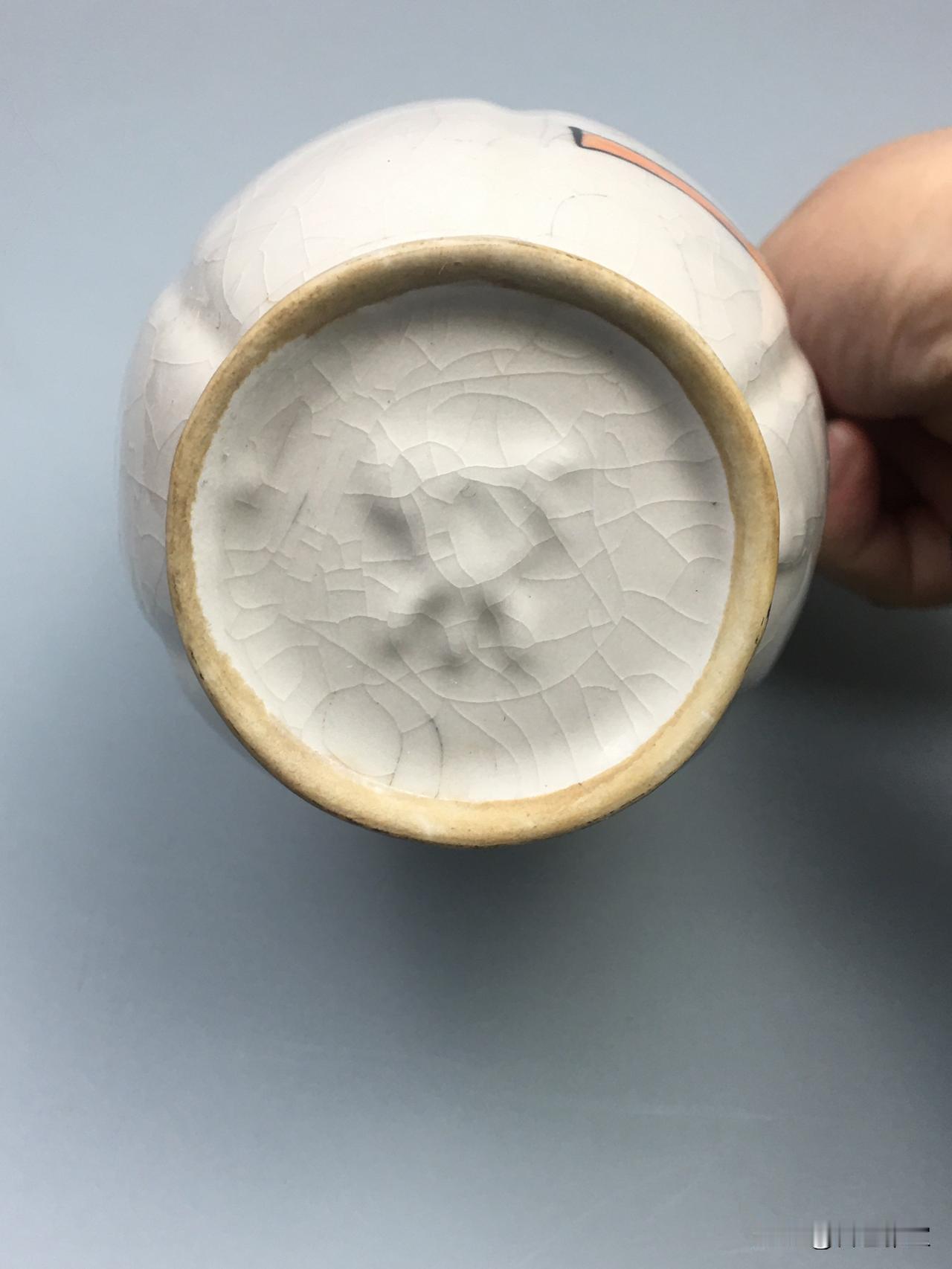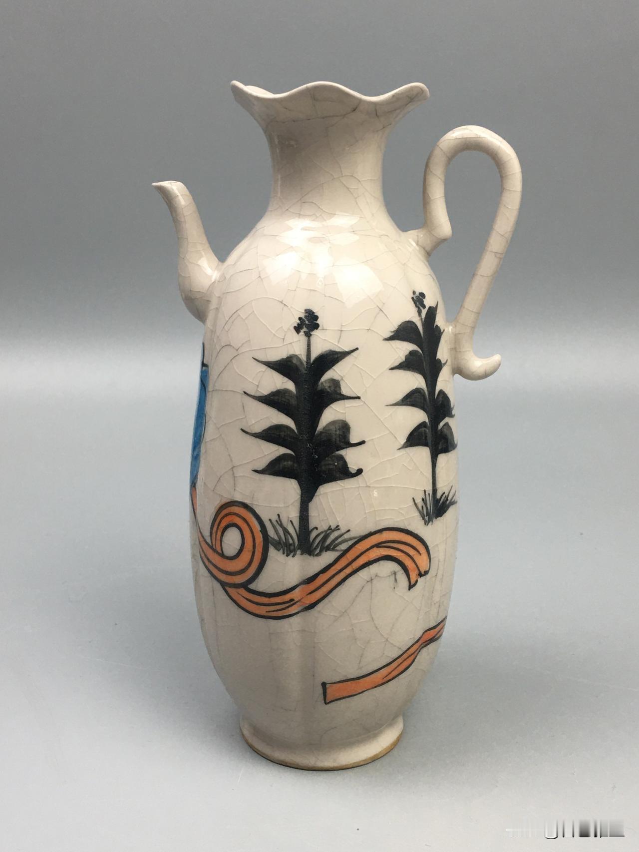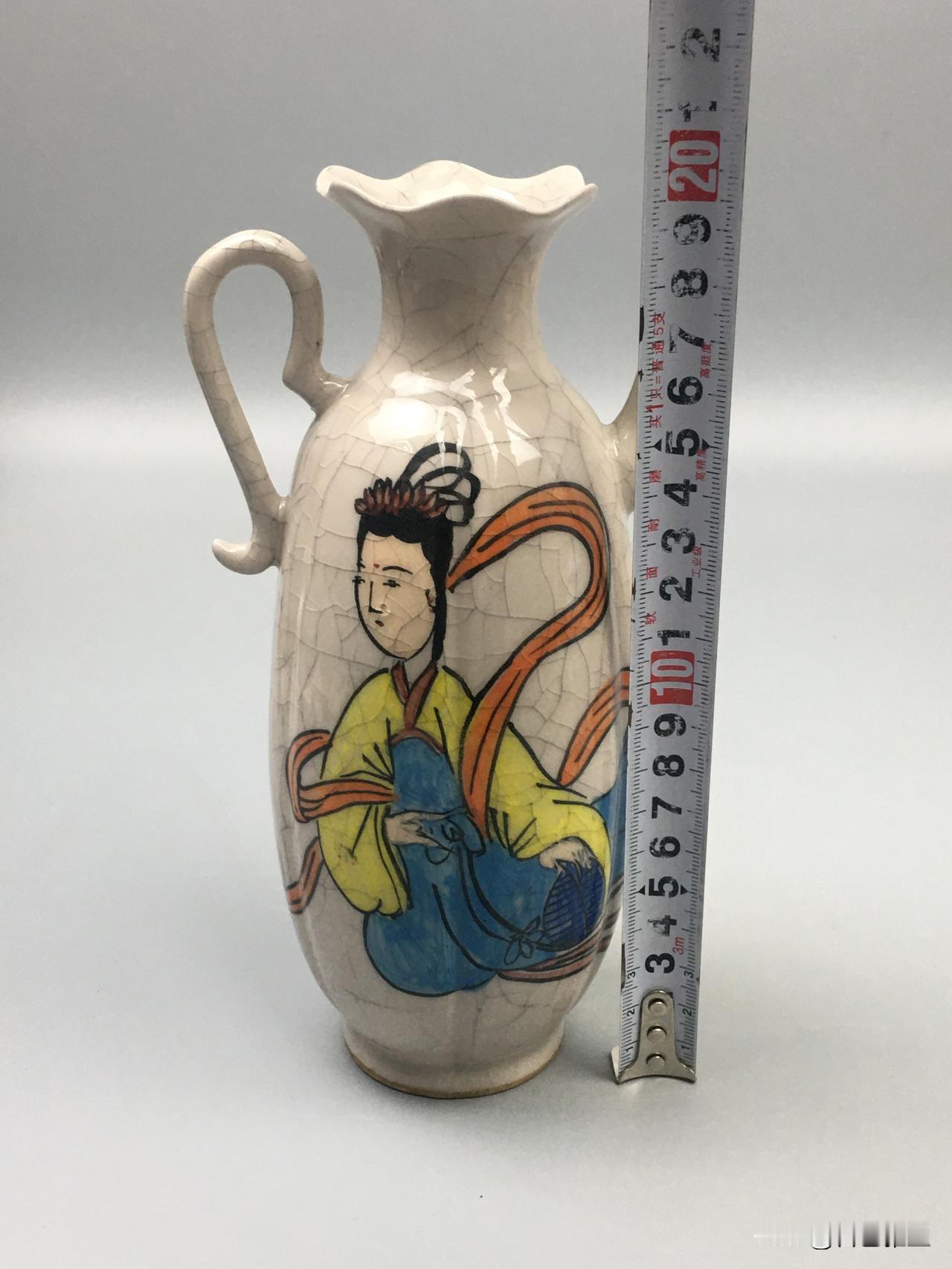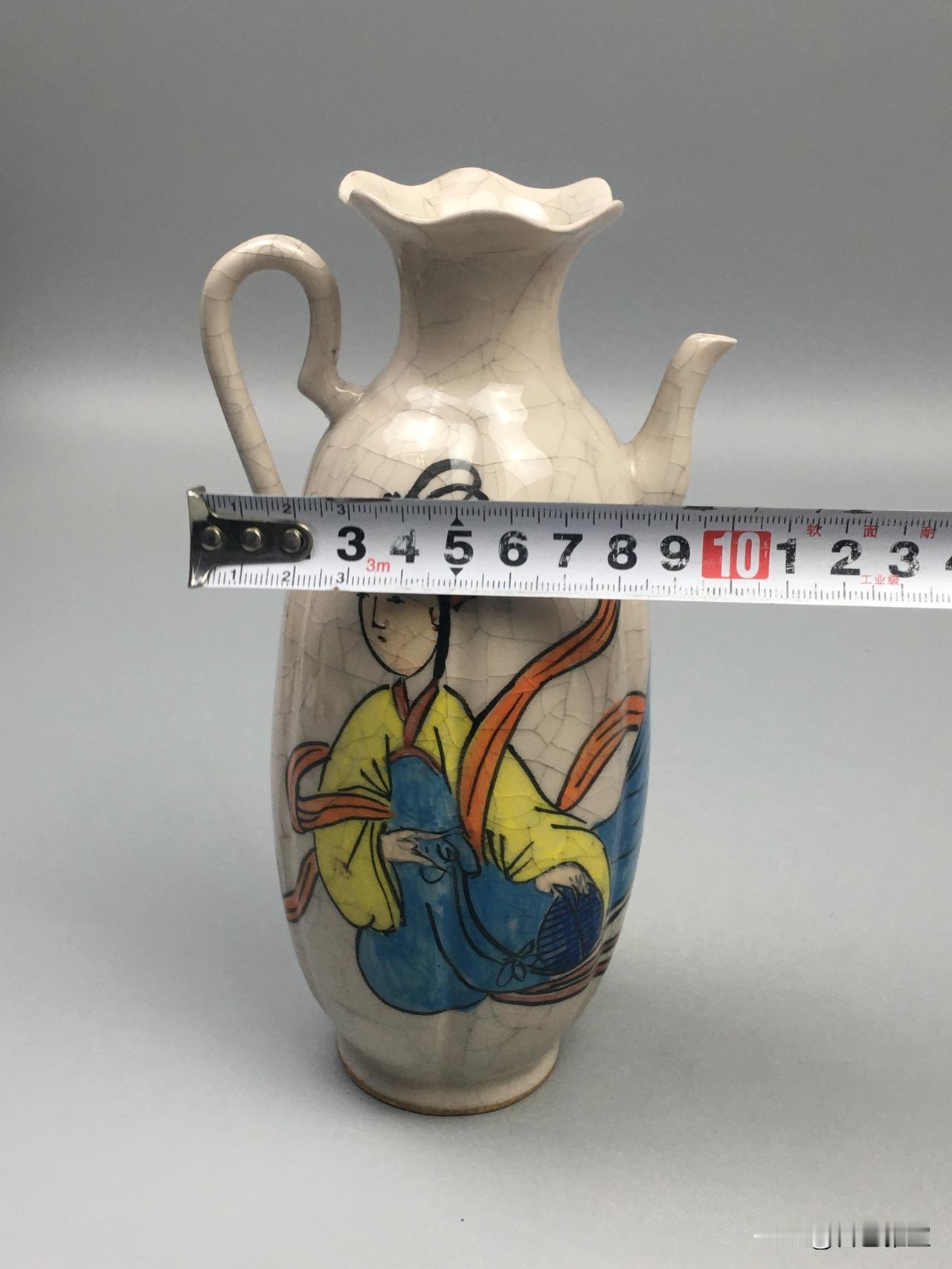 此壶通体施白釉,釉面布满自然冰裂纹,开片纹理细密交错,尽显柴窑"滋润细媚有细纹"的经典特征。花口造型灵动雅致,壶身线条流畅挺拔,彩绘仕女纹饰神态温婉,色彩搭配清新雅致,既保留五代宫廷器的端庄大气,又兼具细腻的装饰美感。