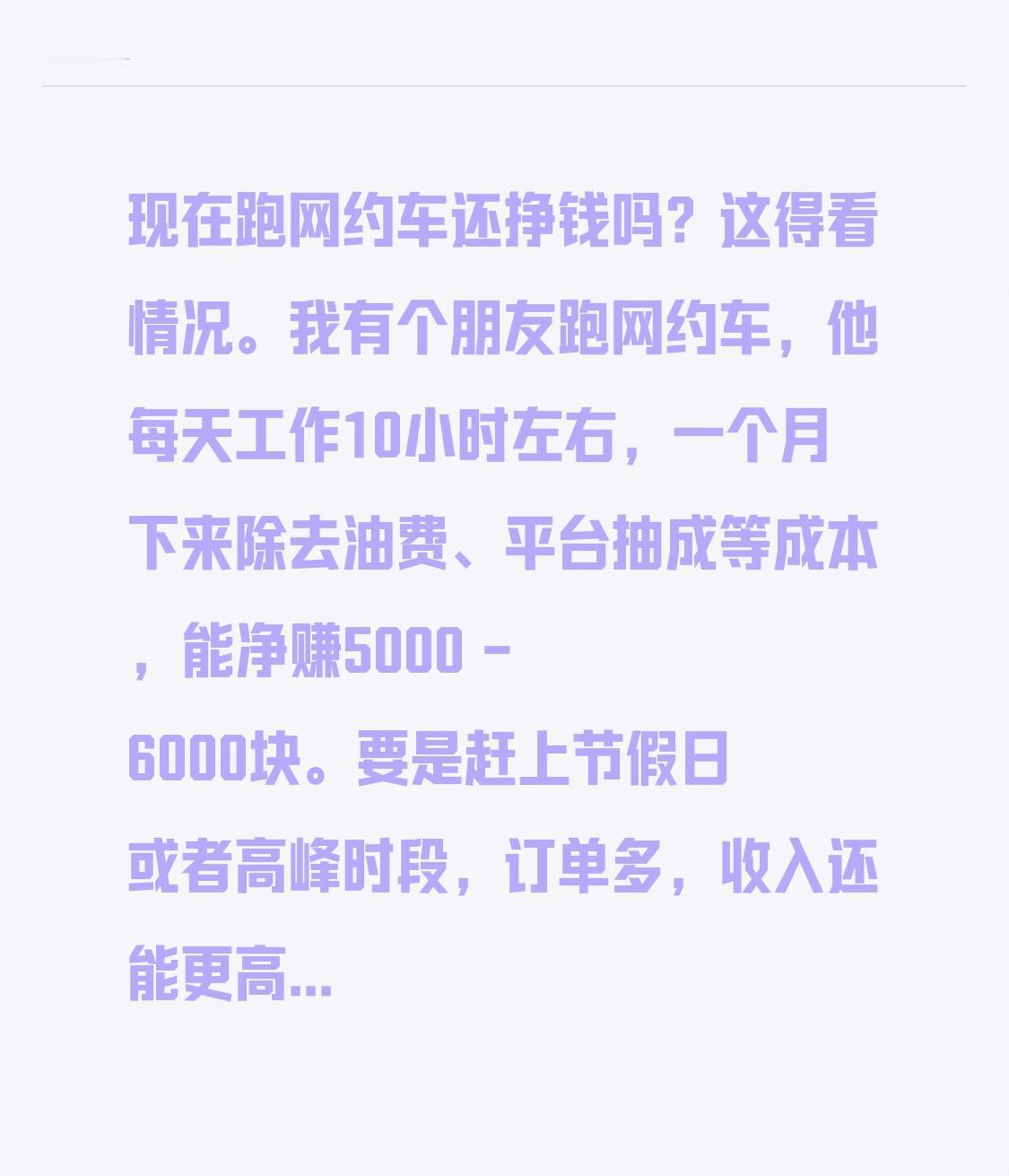 我有个朋友跑网约车,他每天工作10小时左右,一个月下来除去油费、平台抽成等成本,能净赚5000 - 6000块。要是赶上节假日或者高峰时段,订单多,收入还能更高。