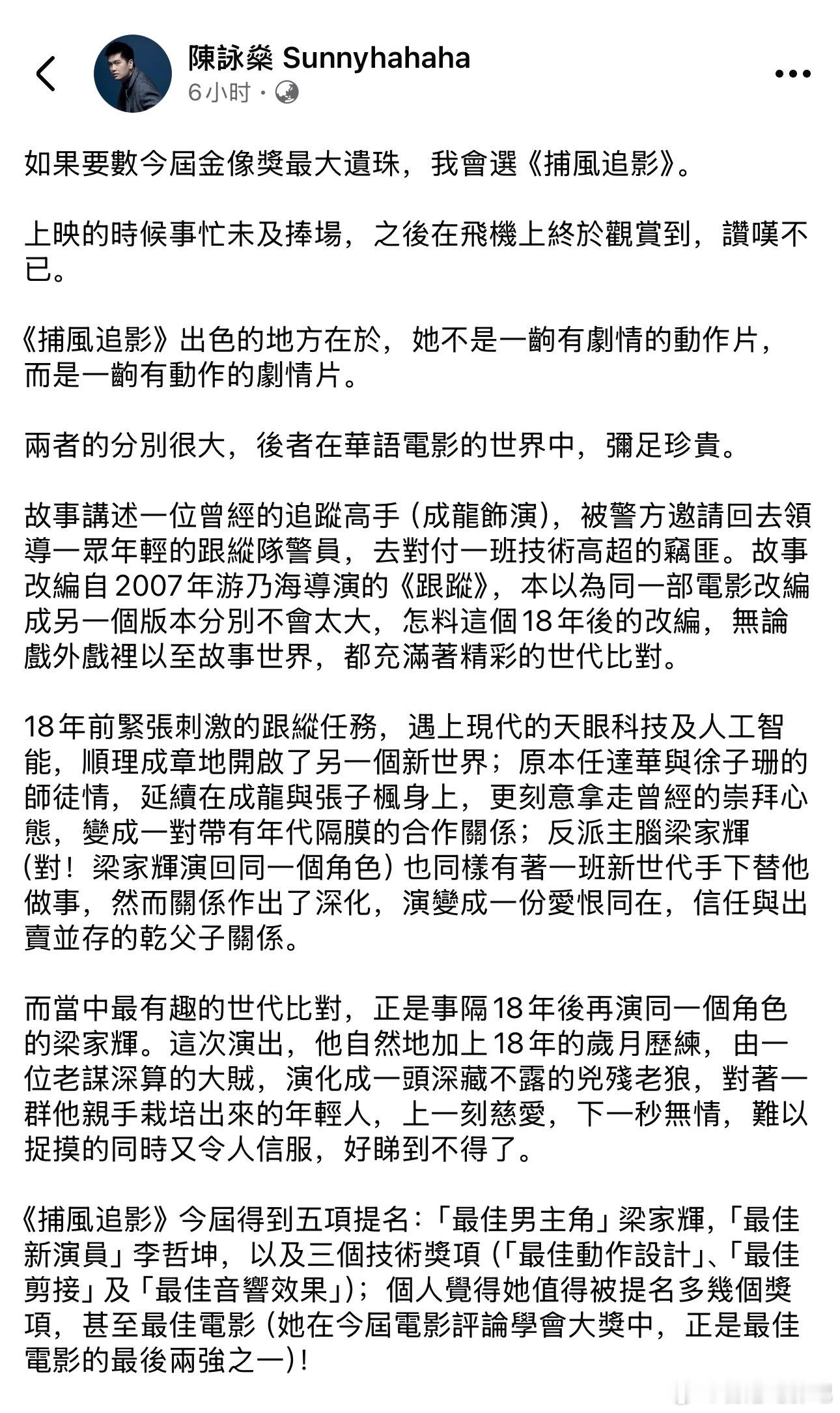 导演陈咏燊发文评《捕风追影》:第44届香港电影金像奖 最大遗珠——如果要数今届金